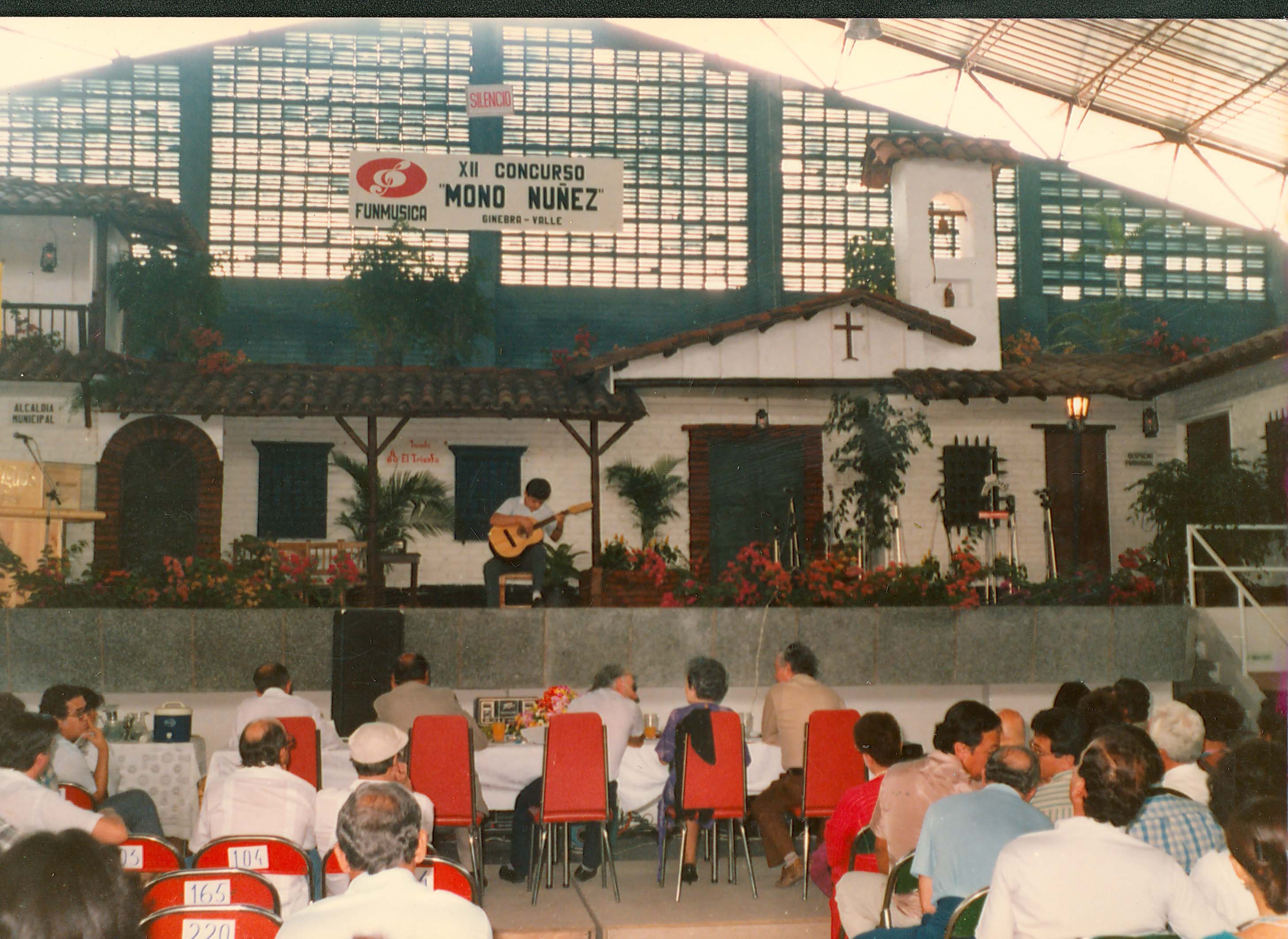 Ginebra, Valle del Cauca. Fundado en 1909. Municipio desde 1954. Economía importante en agricultura, Gastronomía, Ganadería entre otros. Atractivo turístico: Puente Natural Puentepiedra, Iglesia Nuestra Señora del Rosario, Festival “Mono Núñez”. Casa del período Republicano. Observamos en la imagen, presentación en tarima de un hombre con guitarra. Se aprecia presentación en el coliseo de Funmúsica