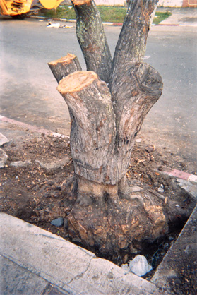 Plano medio. Imagen en picado de árbol cortado. Al fondo pavimento.