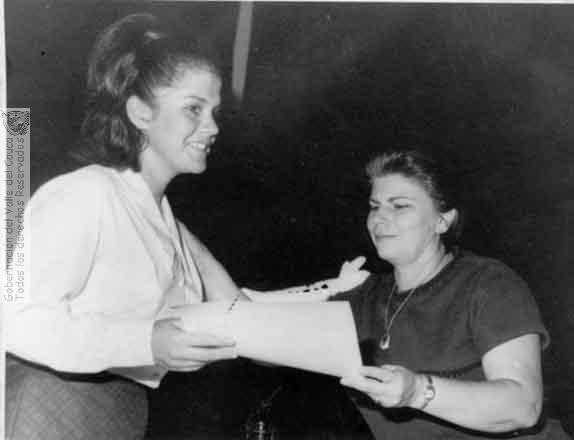 Ceremonia de graducación de Fidelina Arana, entrega el diploma Beariz Acero ex-directora de la Normal. Zarzal. 1965.