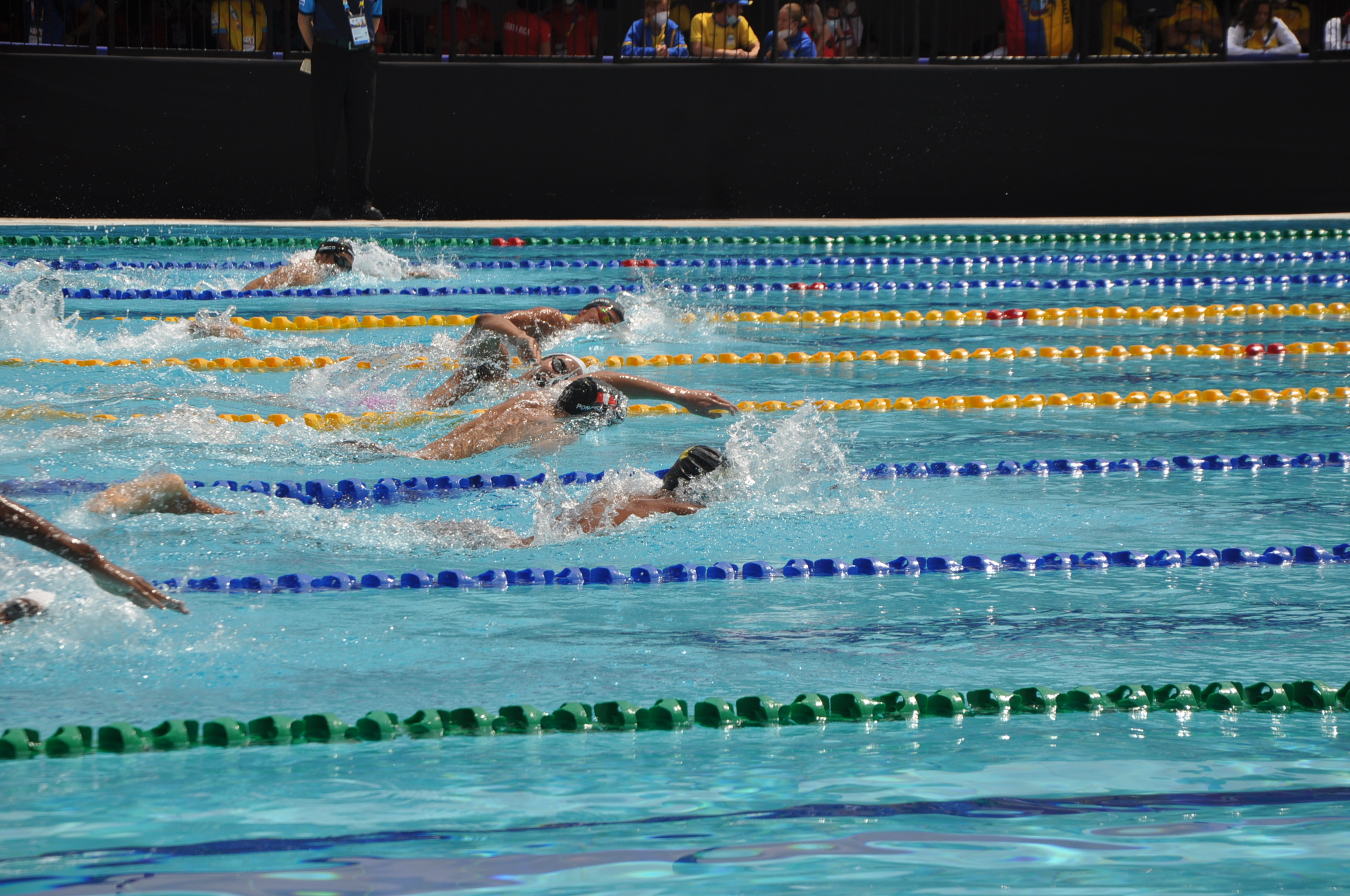 En el registro fotográfico podemos observar a los deportistas participantes en la competencia de natación en los "I Juegos Panamericanos Junior", llevados a cabo en la ciudad de Cali.