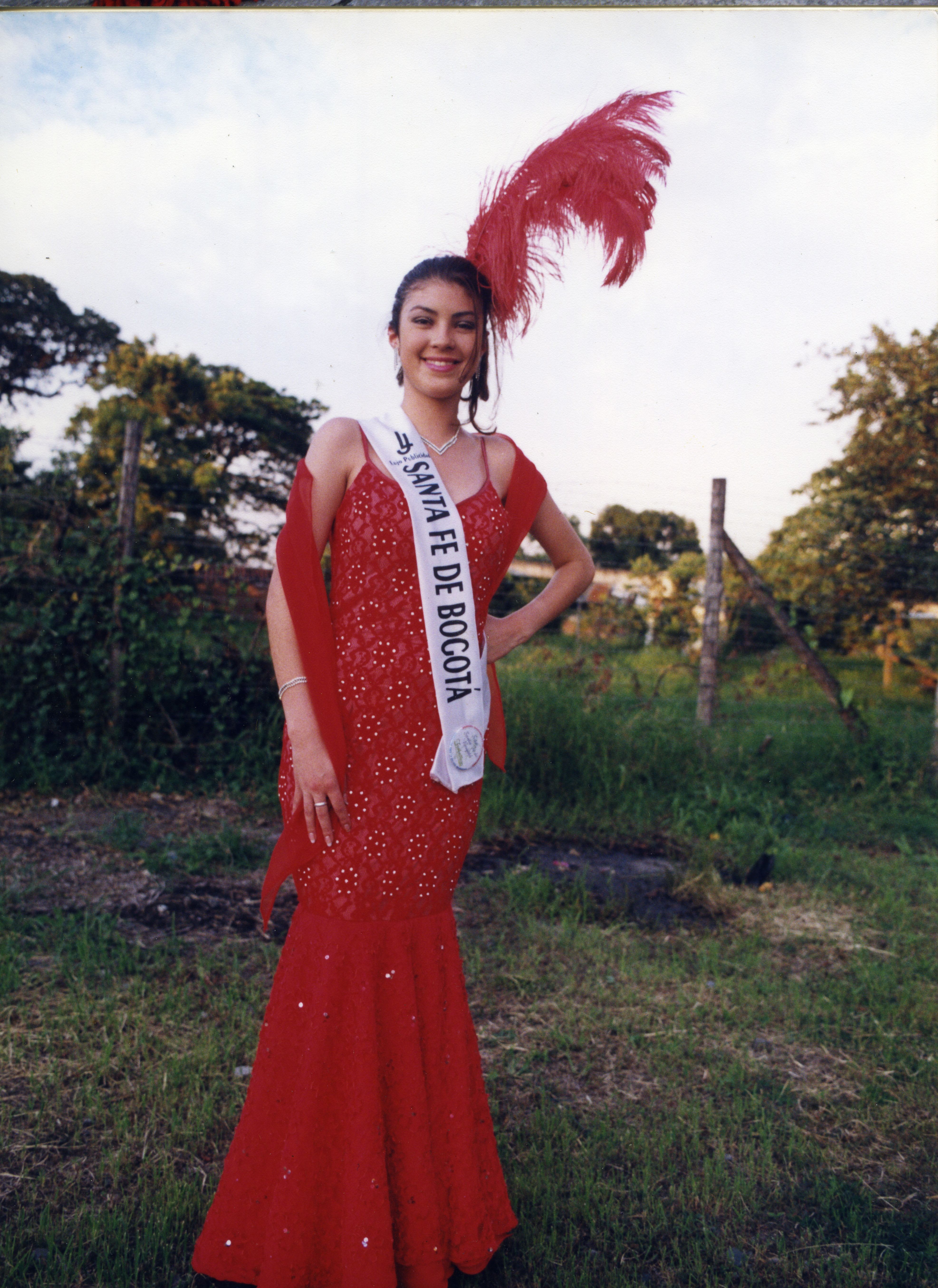 Candidata al Reinado Nacional de la Agricultura por Bogotá. Se aprecia a la reina posando para la cámara con un hermosa vestido de gala de color rojo