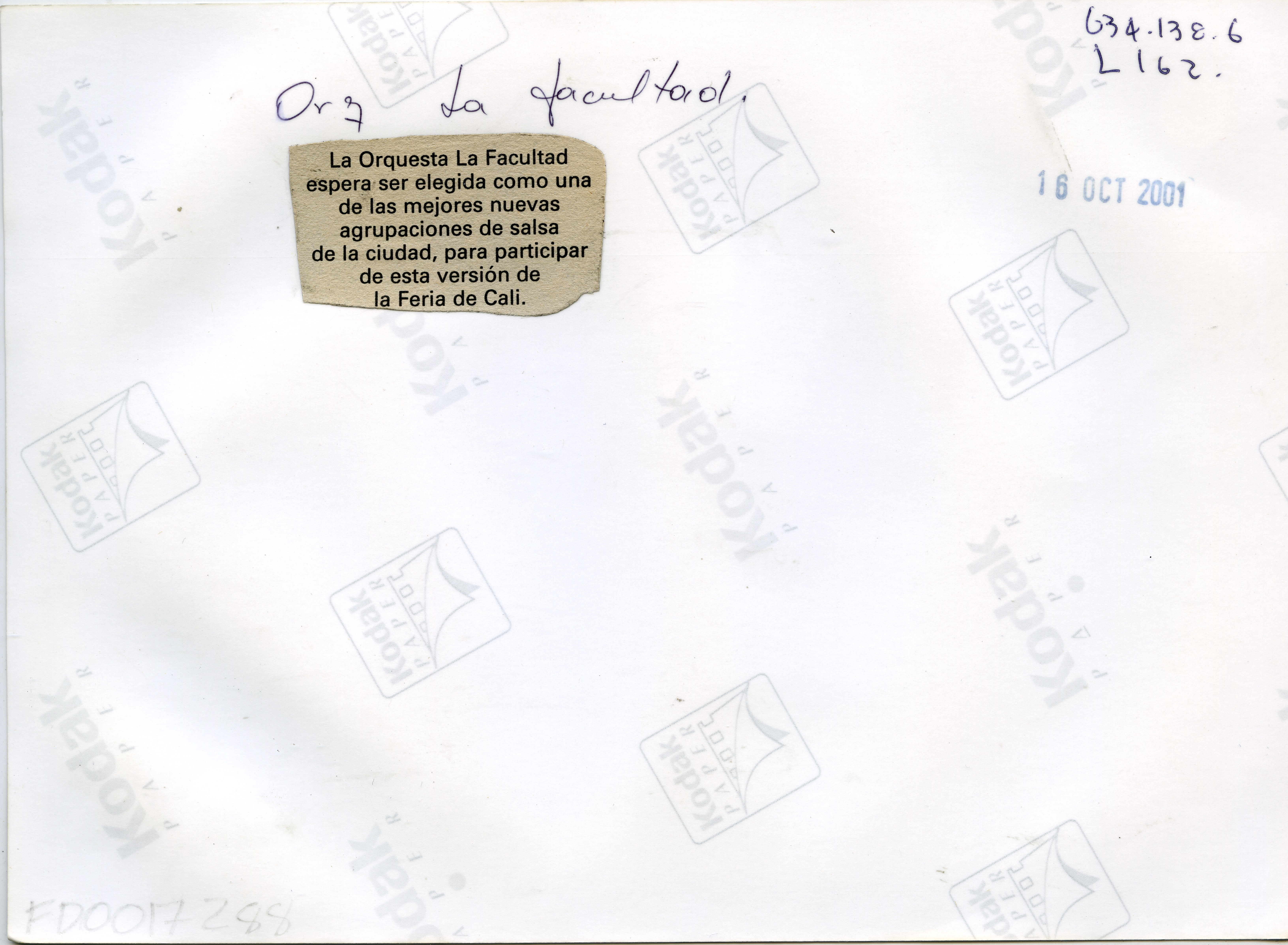 En pleno concierto Cuatro vocalistas La Facultad. Al reverso de la fotografía se anexa recorte: La Orquesta La Facultad espera ser elegida como una de las mejores nuevas agrupaciones de salsa de la ciudad, para participar de esta versión de la Feria de Cali