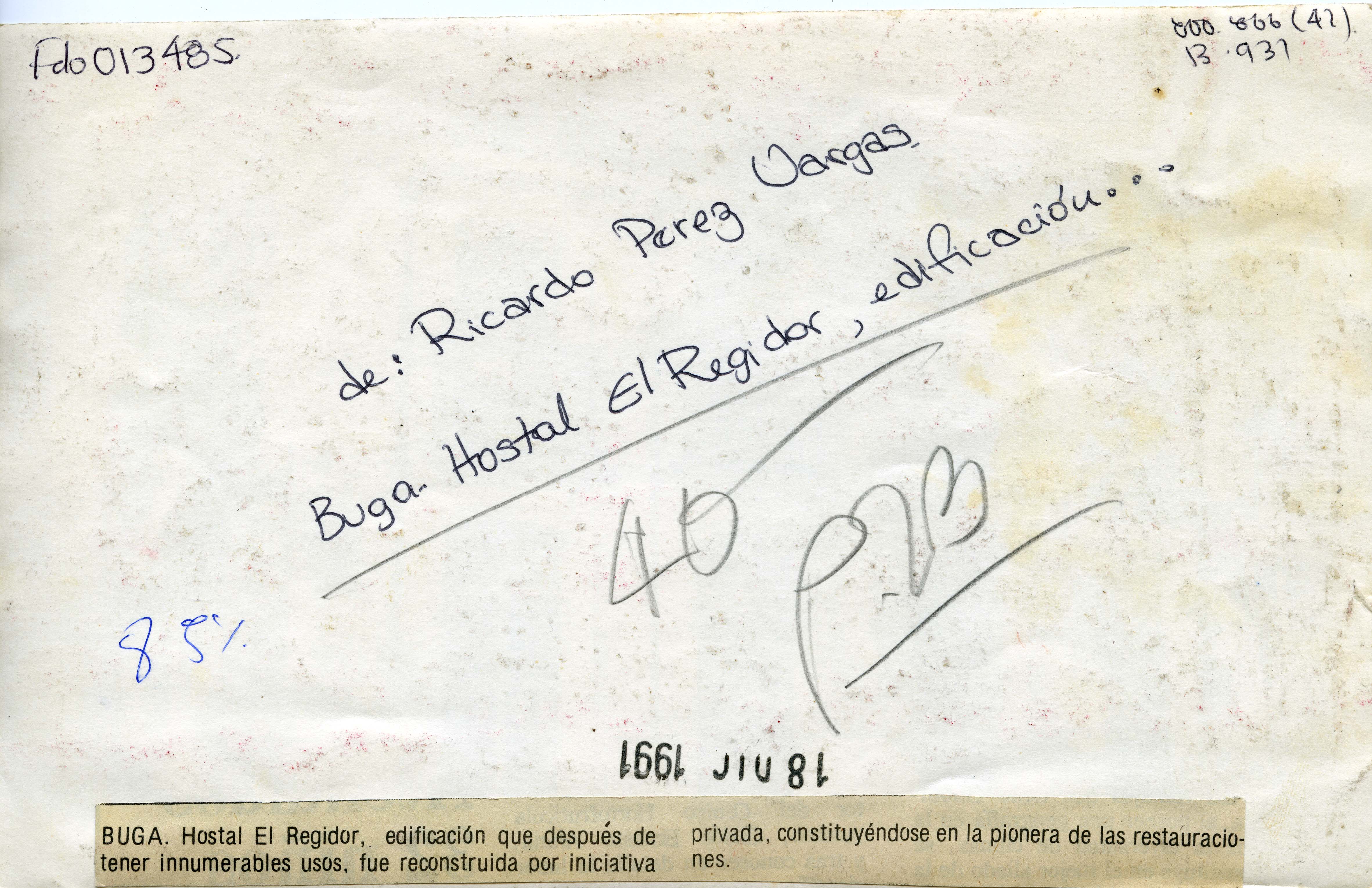 Al reverso de la fotografía se anexa el recorte." Hostal El Regidor, edificación que después de tener innumerables usos, fue reconstruida por iniciativa privada, constituyéndose en la pionera de las restauraciones".