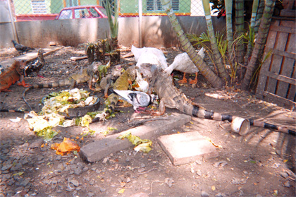 Plano general. Iguanas, palomas y patos comparten el alimento en el parque de las iguanas.