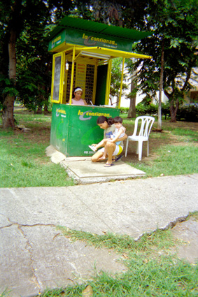 Plano Medio. En el extremo inferior se destaca por la incidencia de la luz del sol, una acera en concreto agrietada y con alguna maleza. En el centro superior, una caseta de apuestas color verde oscuro que tiende a mimetizarse con la vegetación en el fondo. Junto a la caseta tres personas.