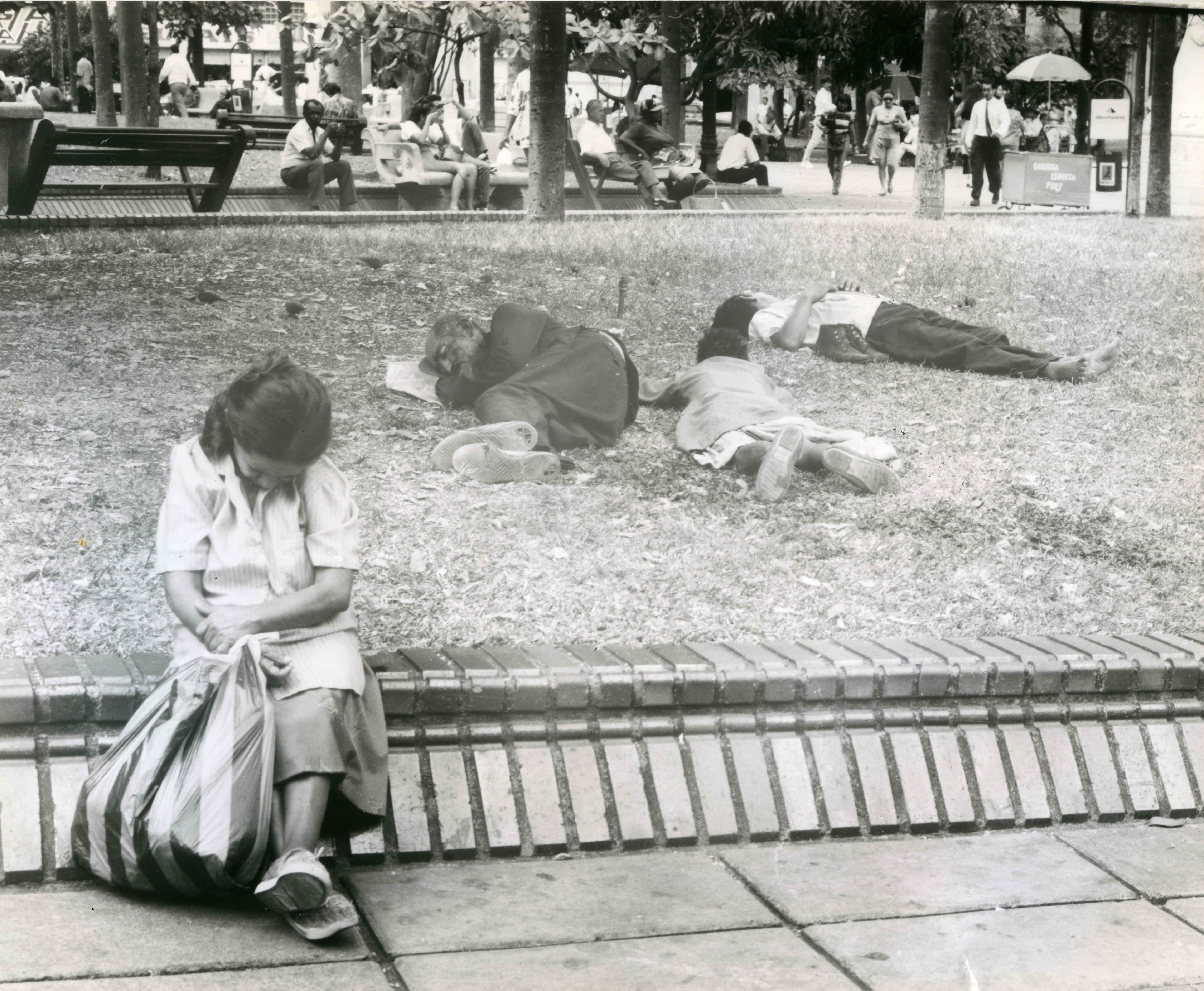 Esta fotografía del Reportero Gráfico Orlando Blandón es una radiografía patética de la situación en que viven numerosos colombianos en Cali y quienes encuentran en los sitios públicos espacio para dormir y huir un poco a la pesadilla que afrontan todos los días >El Archivo del Patrimonio Fotográfico y Fílmico del Valle del Cauca es responsabilidad de la Biblioteca Departamental del Valle Jorge Garcés Borrero, por convenio de cooperación suscrito con la Secretaria del Cultura Departamental, con el fin de aunar esfuerzos para su conservación, preservación y divulgación del Archivo entre la comunidad Vallecaucana, especialmente entre los estudiantes e investigadores que visitan la Biblioteca, propiciando el su uso y consulta permanente. La universidad Icesi es un colaborador en el proceso de difusión, facilitando la tecnología que permite la consulta de las imágenes.
