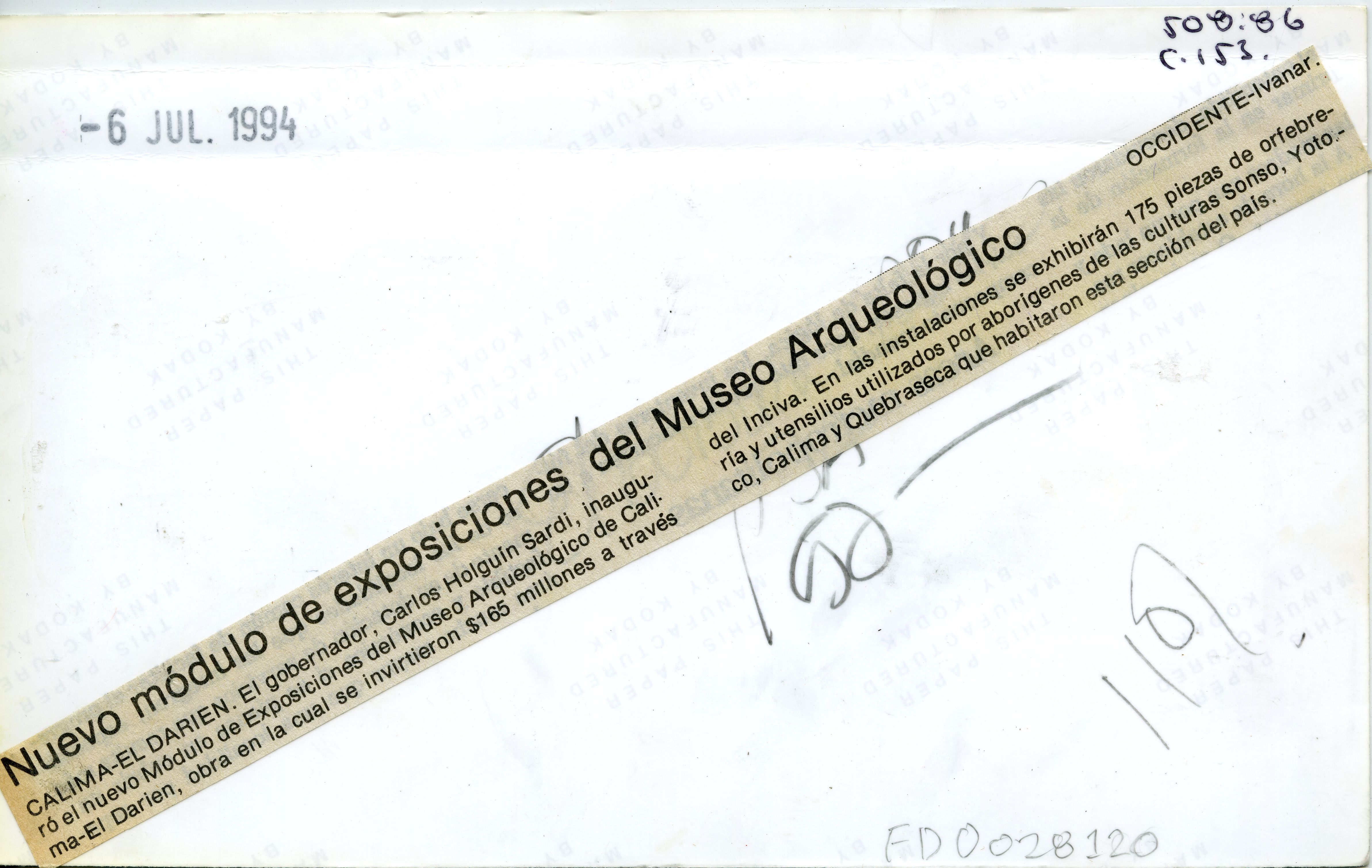 Reverso:"Nuevo módulo de exposiciones del Museo Arqueológico. Calima-El Darién. El gobernador, Carlos Sardi, inauguró el nuevo Módulo de Exposiciones Arqueológico de Calima-El Darién, obra en la cual se invirtieron $ 165 millones a través del inciva. En las instalaciones se exhibirán 175 piezas de orfebrería y utensilios utilizados por aborígenes de las culturas Sonso, Yotoco, Calima y Quebraseca que habitaron esta sección del país"