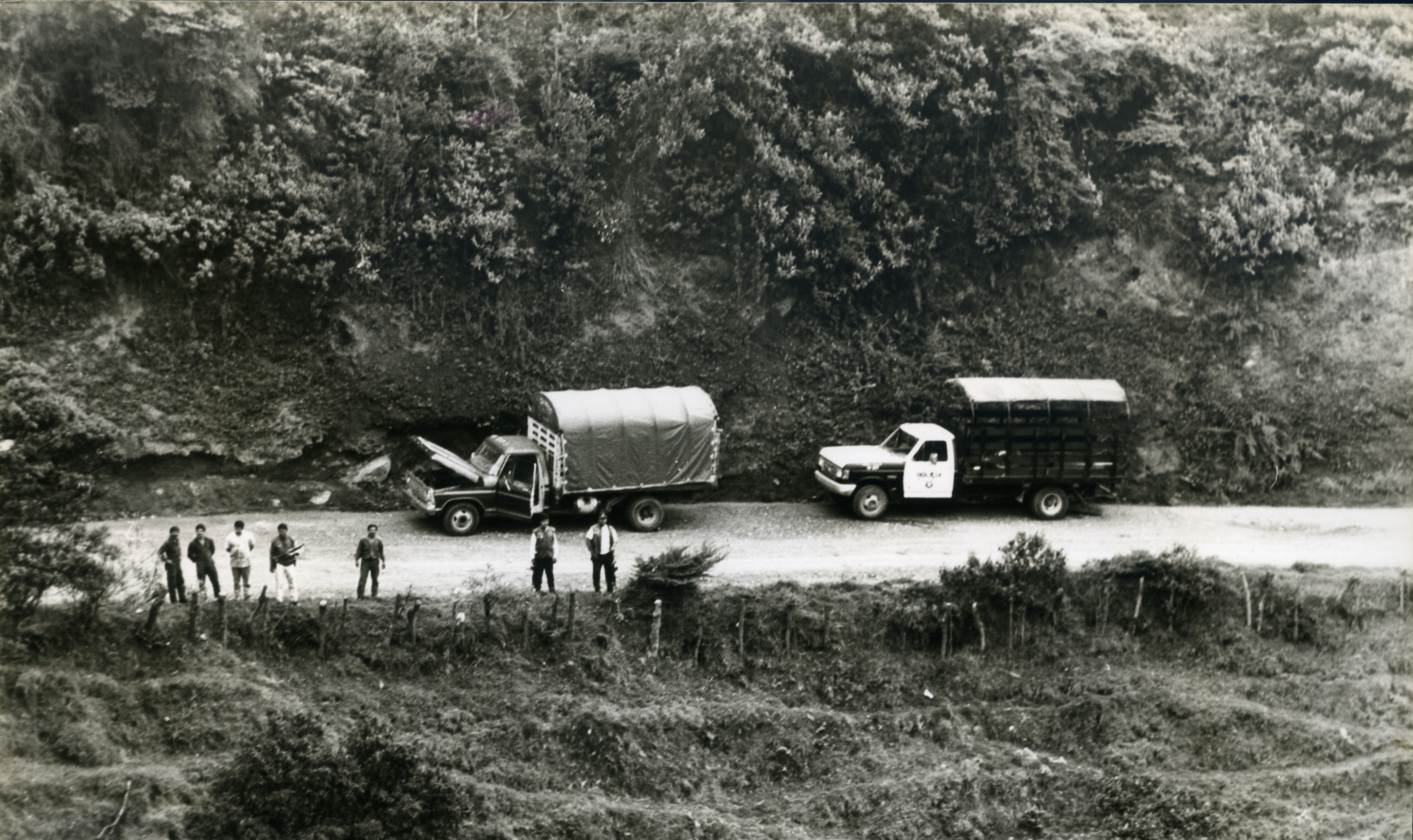 En la vereda Campamento, municipio de Puracé se perpetro el criminal asalto guerrillero contra un convoy de la policía. En la composición gráfica, tomada desde un helicóptero se aprecian los camiones que transportaban a los agentes y oficiales que fueron emboscados por los subversivos.