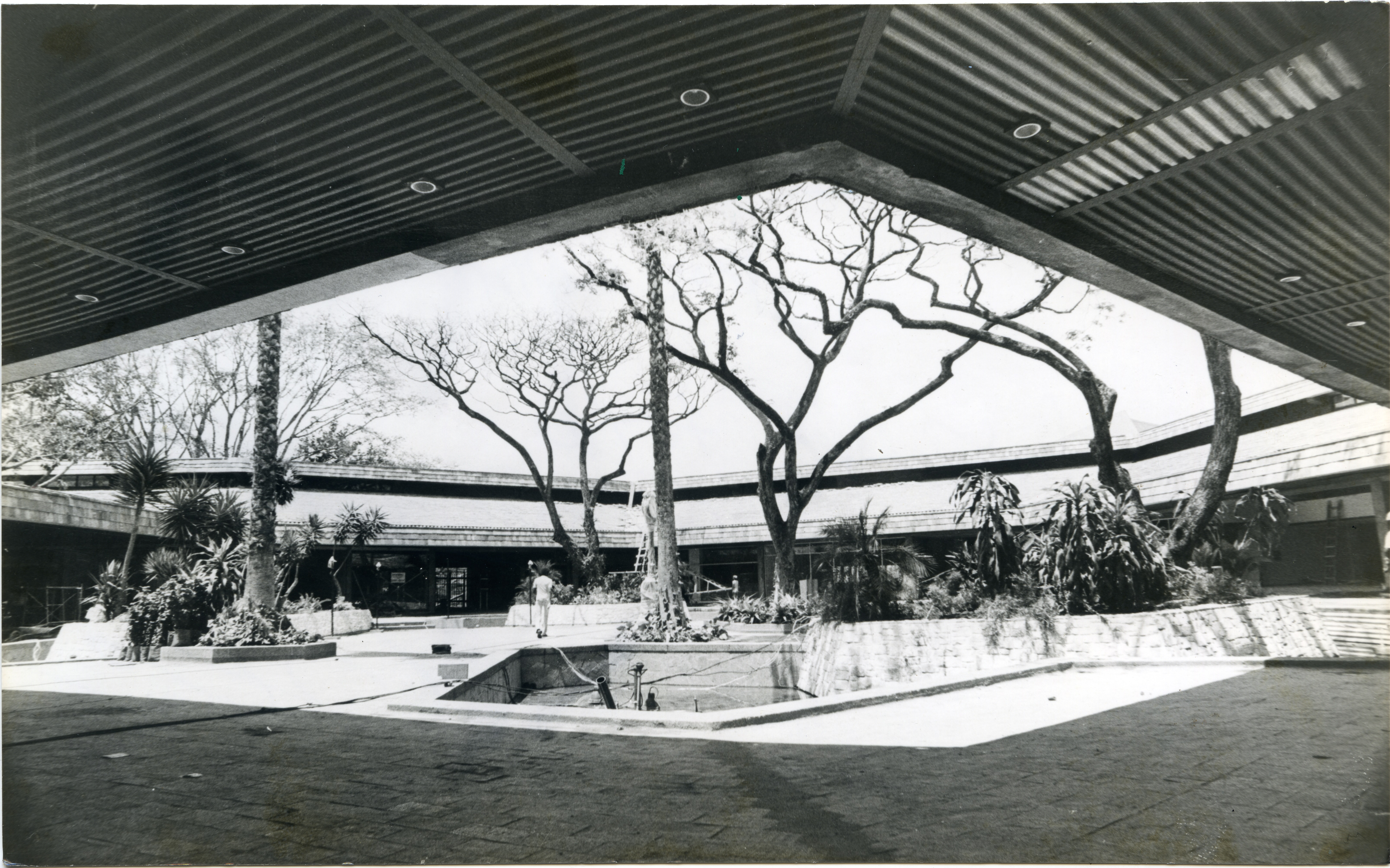 Árboles y fuentes en medio de la plaza central del Centro Comercial Unicentro.