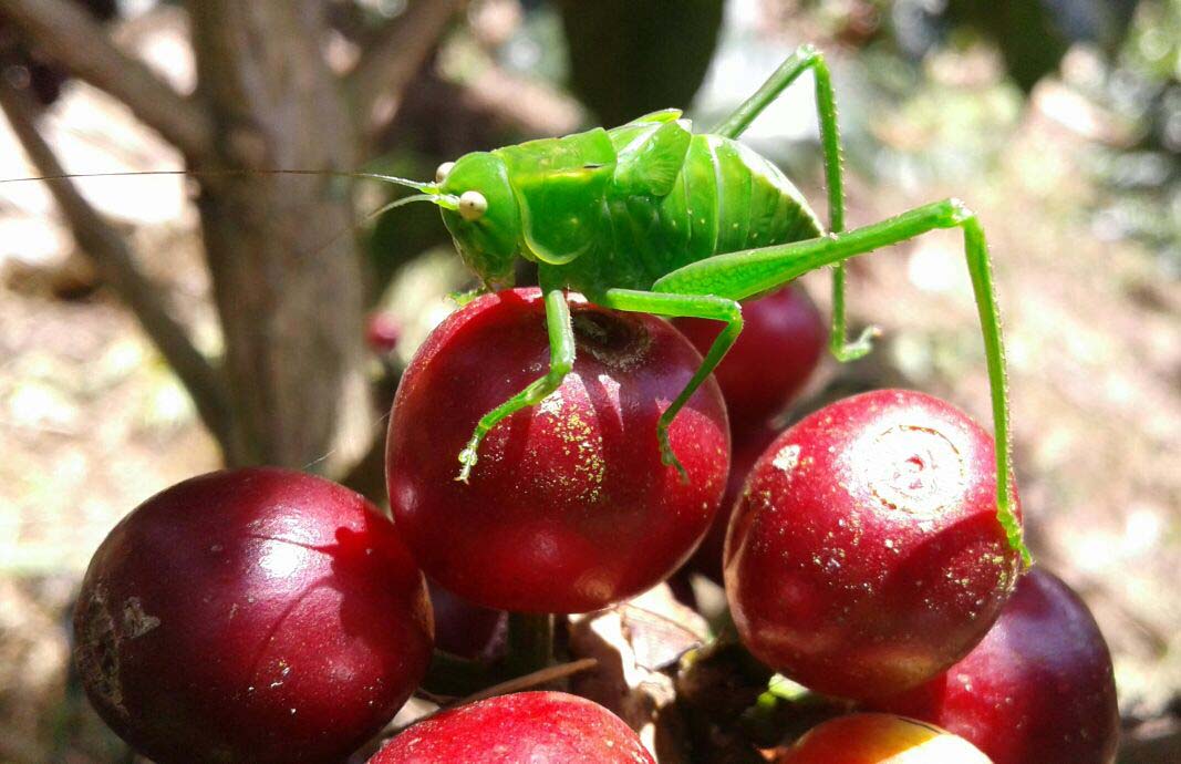 El Águila, Valle del Cauca. Fundado en 1899, por Emelecio Duque, Marcelino Echeverri y los hermanos Bernardo y Natalio Serna. Municipio desde 1953. Economía importante en agricultura, caficultura, ganadería, minería, explotación forestal, etc. Observamos en la imagen, un grillo en el café cereza