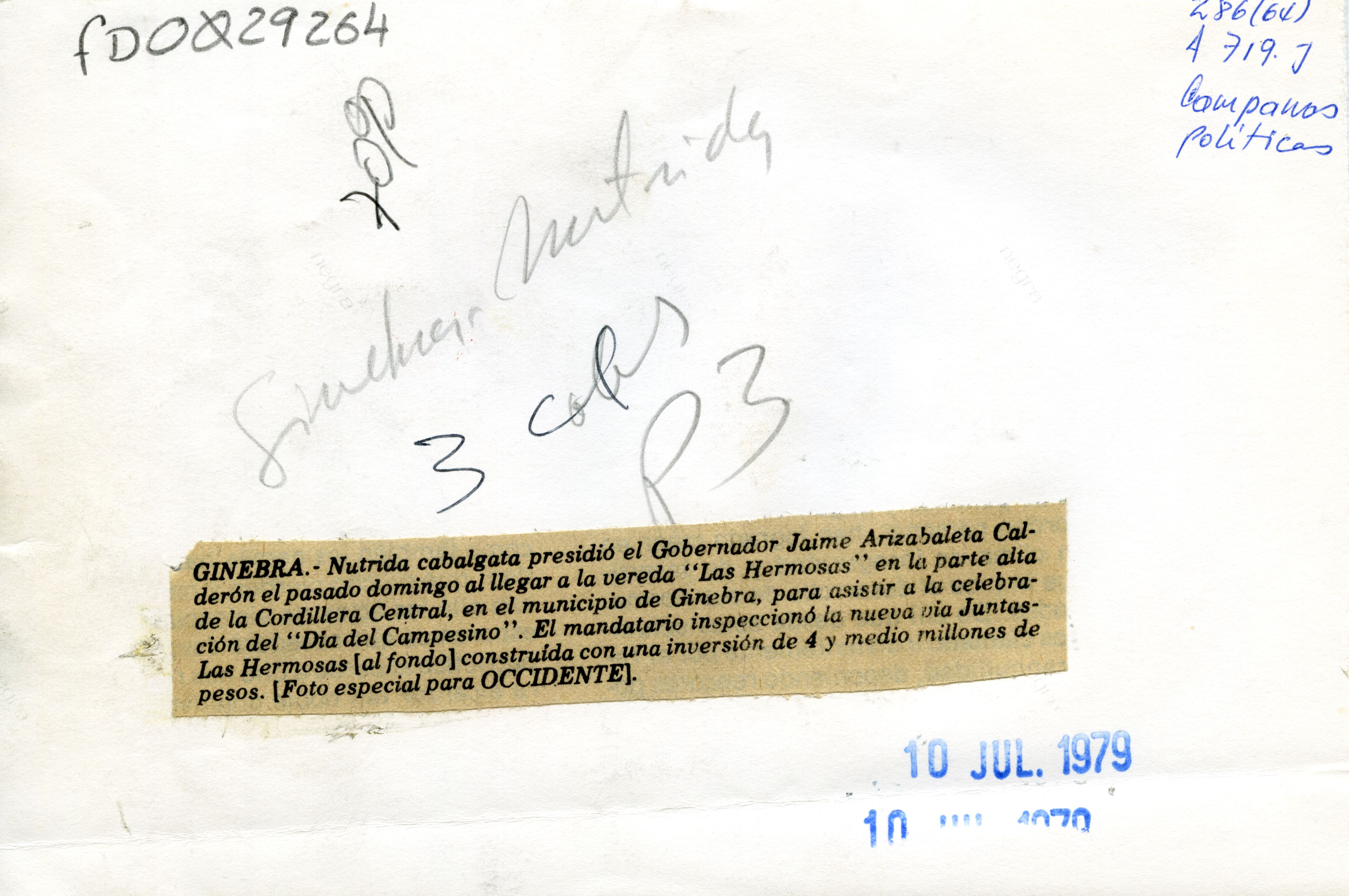 Jaime Arizabaleta Calderón fue gobernador del valle en el periodo del 1 de septiembre de 1978 al 11 de septiembre de 1980. Perteneció al partido Liberal Colombiano. Se observa Jaime Arizabaleta Calderón, en el municipio de ginebra Valle del Cauca haciendo una cabalgata en la vereda "las hermosas" en la parte alta de la cordillera central, para asistir a la celebración del "día del campesino" y la inspección de la nueva vía juntas las hermosas.
