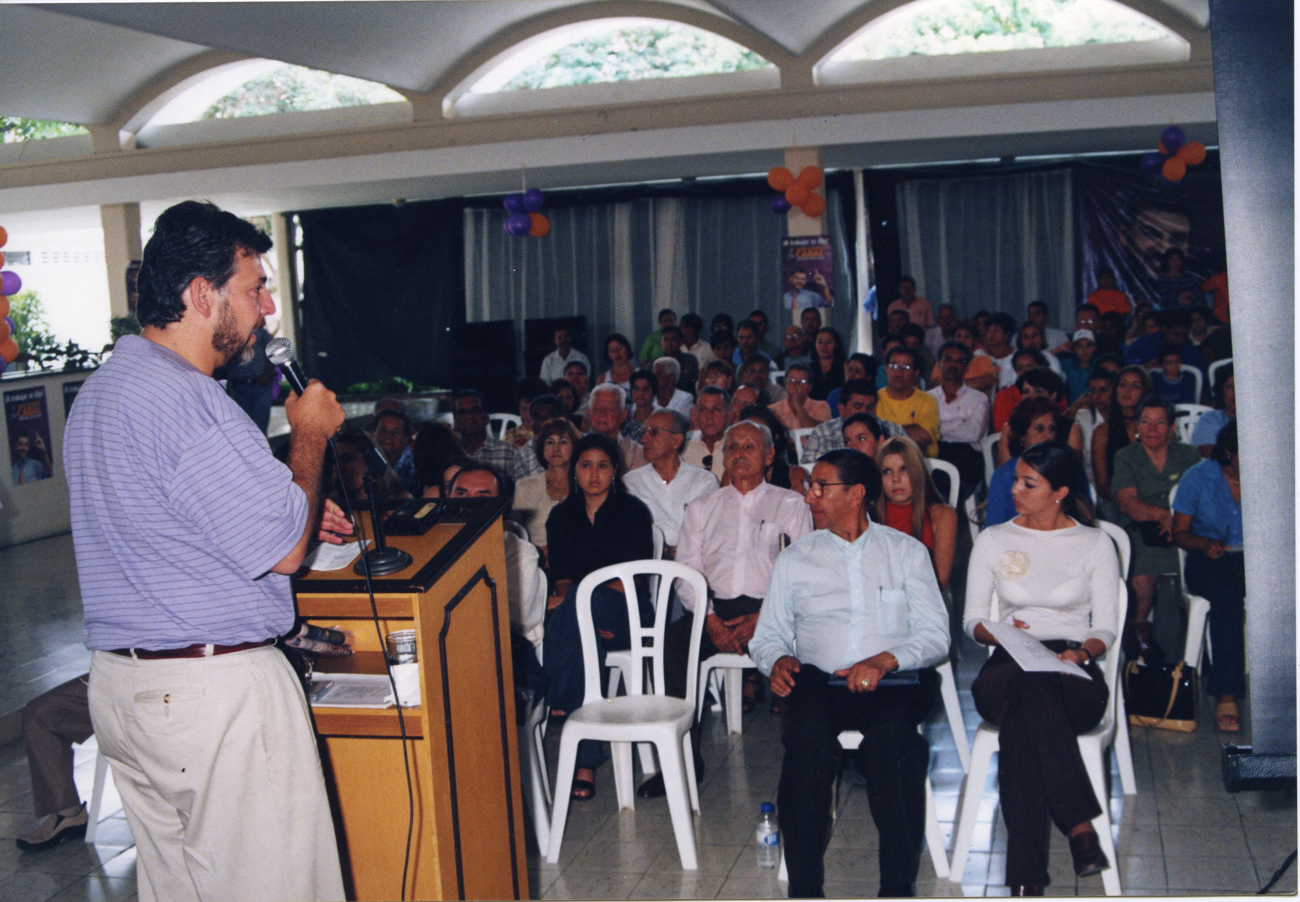 En la composición gráfica de la imagen, podemos observar a Jaime Alberto cabal, candidato para el Senado dirigiéndose desde un atril a un grupo de personas, al fondo de la imagen es posible observar propaganda política sobre el candidato.