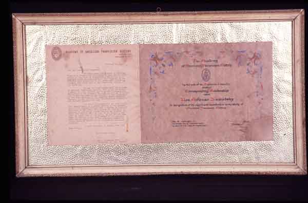Diploma y carta de la Academia Americana de Historia. Convento de San Joaquín y Museo Religioso. Cali, C. 1990