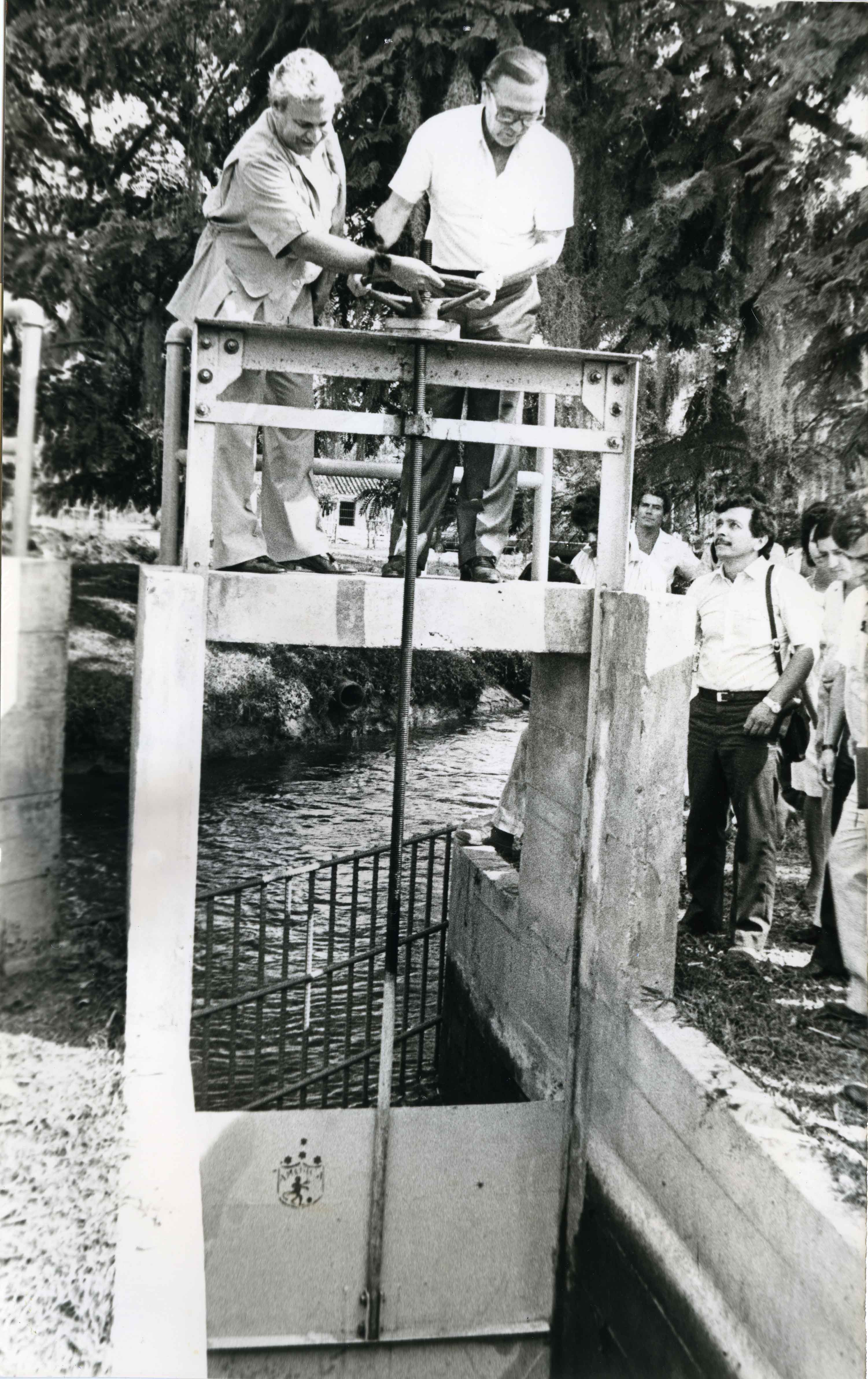 En el pie de foto dice lo siguiente: Sifón invertido. Treinta y cuadro millones de pesos invirtió el gobierno municipal de Ernesto León Cuadros en la construcción de un sifón invertido que permitiría el aprovechamiento de nuevas aguas para el acueducto. El alcalde aparece con el gobernador del Valle, Jorge Herrera Barona, observando algunos aspectos de la obra que fue dada al servicio.- El Archivo del Patrimonio Fotográfico y Fílmico del Valle del Cauca es responsabilidad de la Biblioteca Departamental del Valle Jorge Garcés Borrero, por convenio de cooperación suscrito con la Secretaria del Cultura Departamental, con el fin de aunar esfuerzos para su conservación, preservación y divulgación del Archivo entre la comunidad Vallecaucana, especialmente entre los estudiantes e investigadores que visitan la Biblioteca, propiciando el su uso y consulta permanente. La universidad Icesi es un colaborador en el proceso de difusión, facilitando la tecnología que permite la consulta de las imágenes.