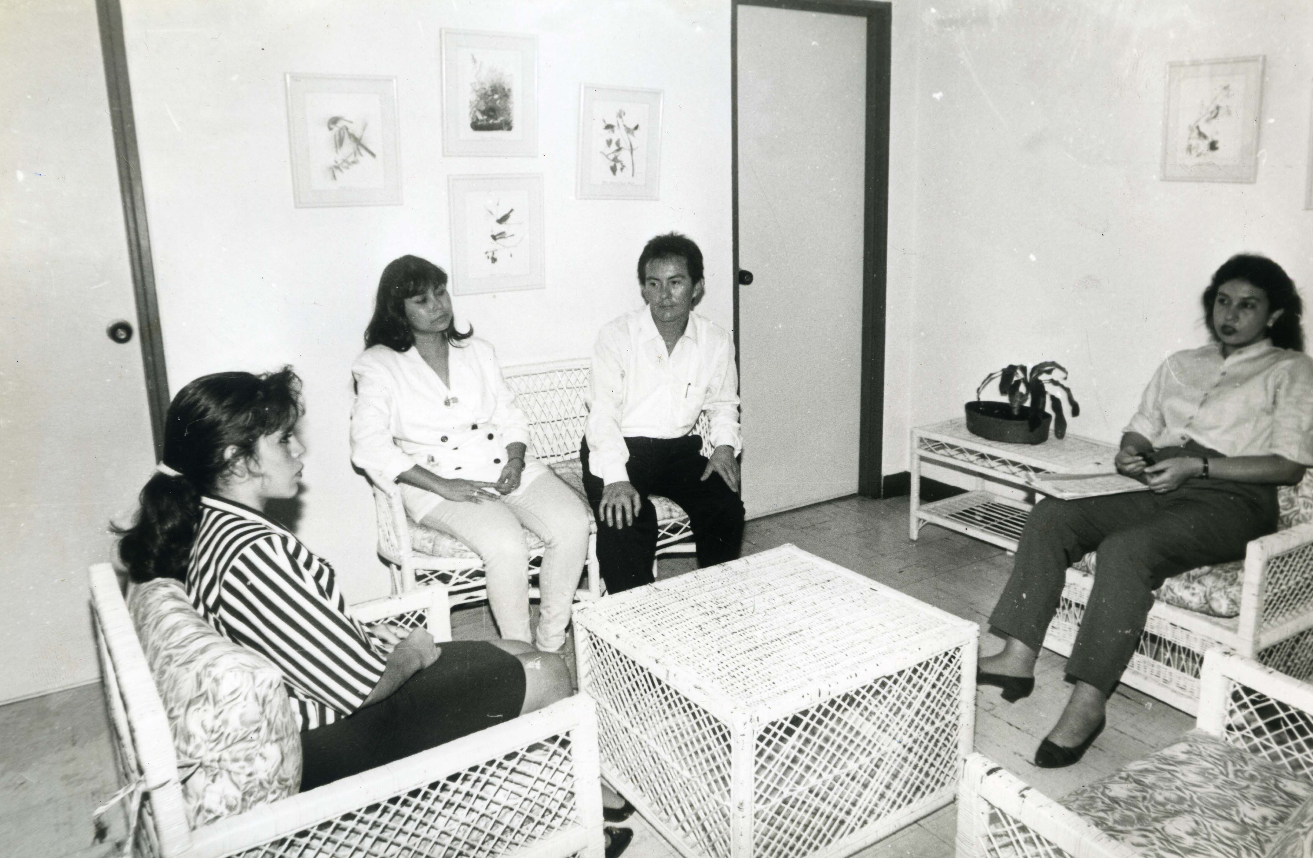 En el pie de foto dice lo siguiente: cientos de viajeros se benefician desde hace cinco años del centro de alojamiento que funciona en Palmaseca. Observamos tres mujeres y un hombre sentados en la sala de espera del hotel
