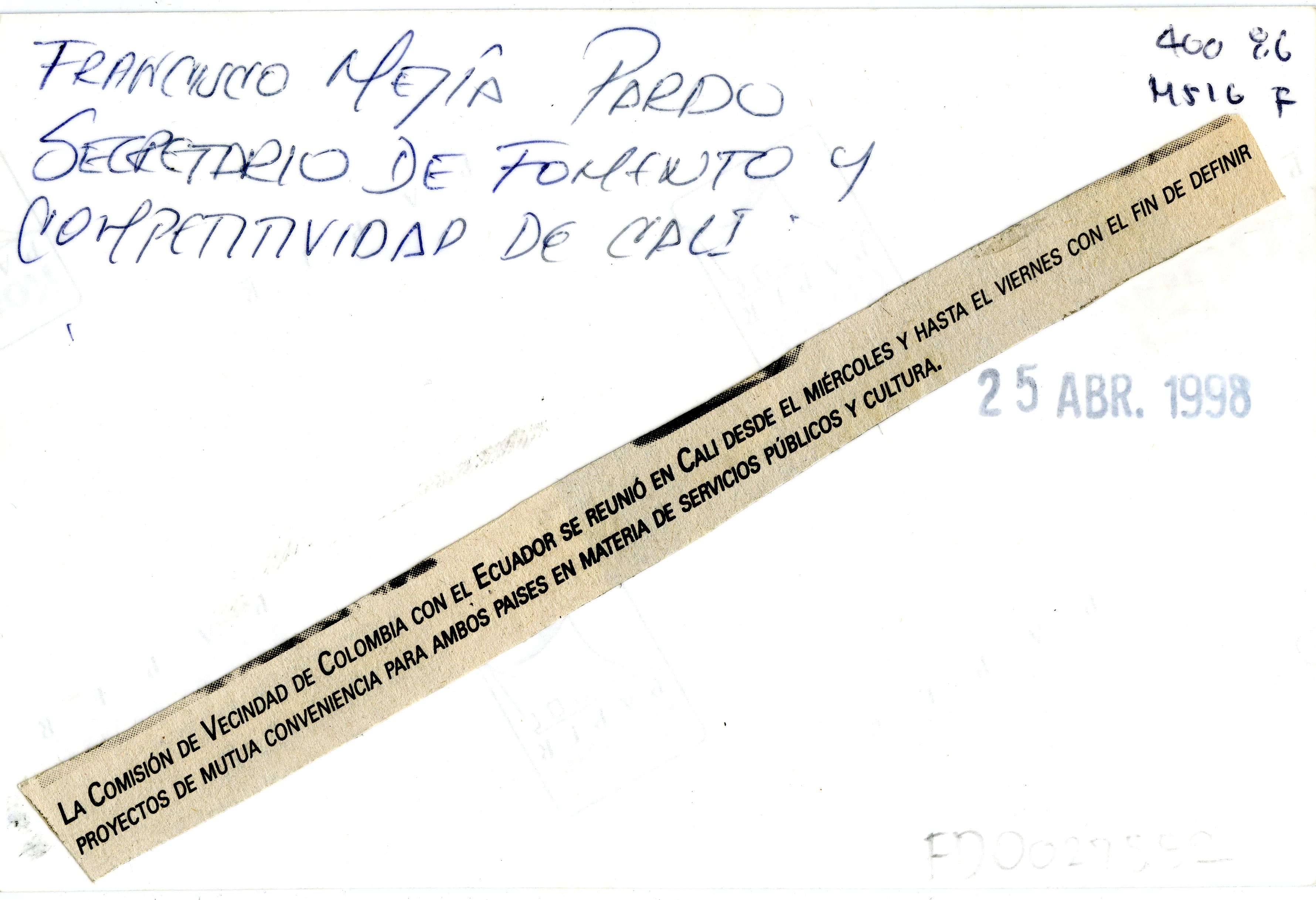 Reverso: " La comisió de Vecindad de Colombia con el Ecuador se reunió en Cali desde el miércoles y hasta el viernes con el fin de definir proyectos de mutua conveniencia para ambos paises de servicios públicos y cultura."