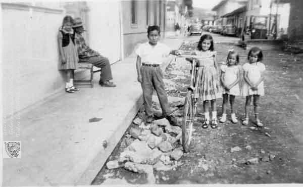Luis Adán Montoya con sus nietos en el andén de su casa, se observa la calle aún sin pavimentaer y las niñas jugando con la bicicleta