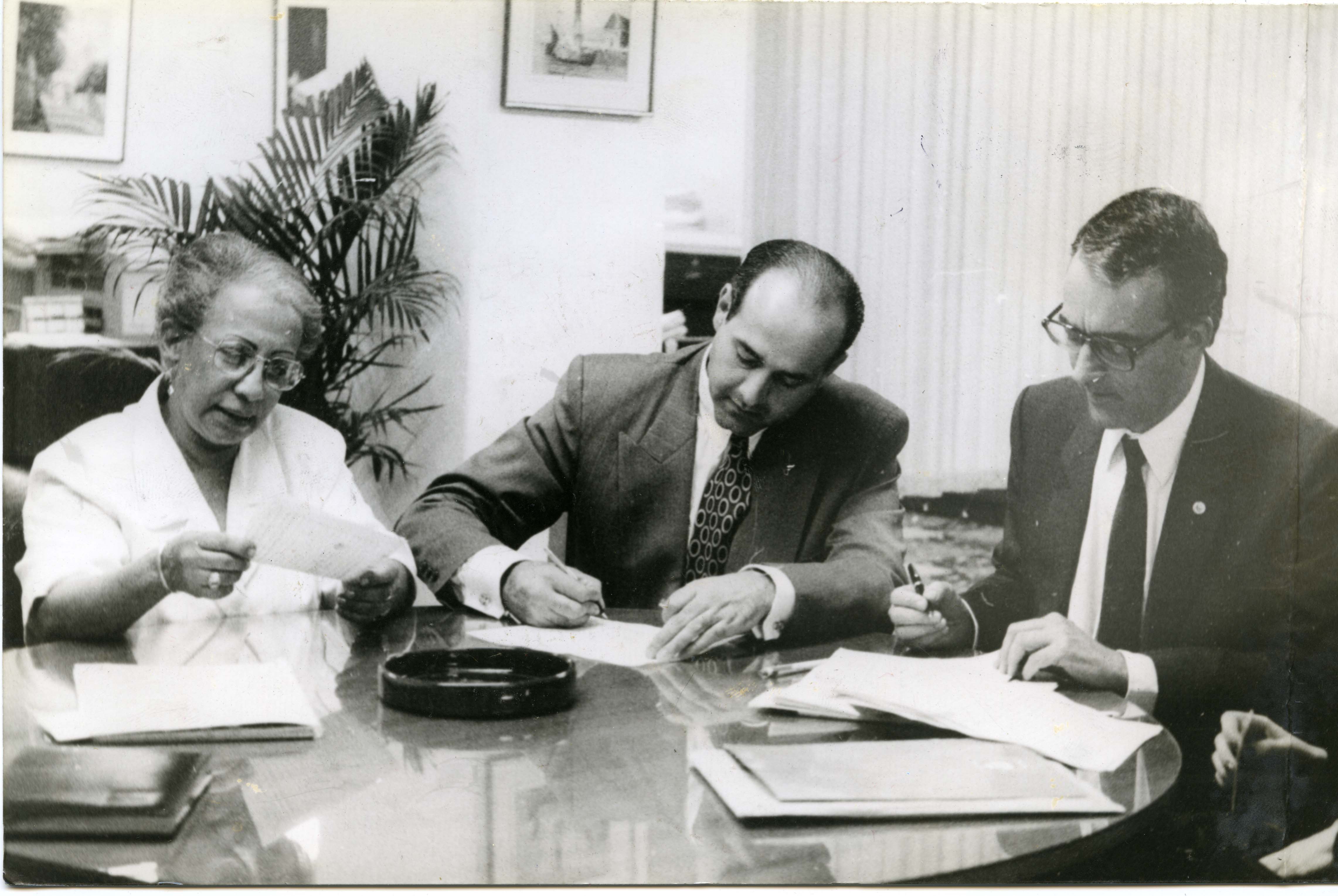 En el pie de foto dice lo siguiente: Aparecen de izquierda a derecha, Minerva Rayo, representante del Notario 13 . Jorge Enrique Botero, gerente general de ciudad Chipichape y Munir Falab Isaa, presidente de Cine Colombia, cuando firmaban los docuemntos mediante los cuales se garantiza la construcción de un moderno complejo cinematográfico en la mencionada ciudadela.- El Archivo del Patrimonio Fotográfico y Fílmico del Valle del Cauca es responsabilidad de la Biblioteca Departamental del Valle Jorge Garcés Borrero, por convenio de cooperación suscrito con la Secretaria del Cultura Departamental, con el fin de aunar esfuerzos para su conservación, preservación y divulgación del Archivo entre la comunidad Vallecaucana, especialmente entre los estudiantes e investigadores que visitan la Biblioteca, propiciando el su uso y consulta permanente. La universidad Icesi es un colaborador en el proceso de difusión, facilitando la tecnología que permite la consulta de las imágenes.