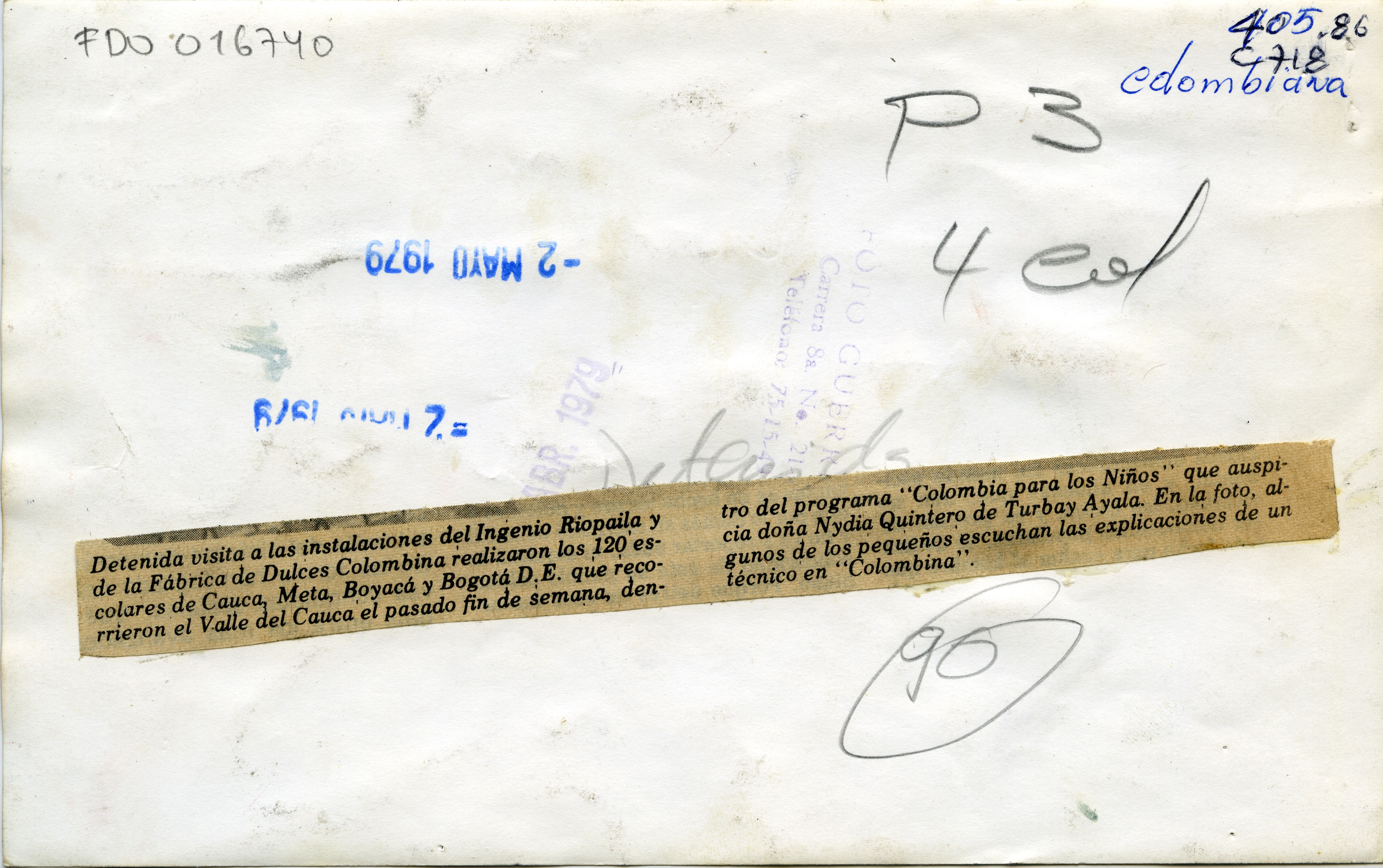 Al reverso de la fotografía se anexa recorte: "Detenida visita a las instalaciones del Ingenio Riopaila y de la Fábrica de Dulces Colombina realizaron los 120 escolares de Cauca, Meta, Boyacá, Bogotá D.E que recorrieron el Valle del Cauca el pasado fin de semana, dentro del programa "Colombia para los niños" que auspicia doña Nydia Quintero de Turbay Ayala. En la foto, algunos de los pequeños escuchan las explicaciones de un técnico en Colombia."
