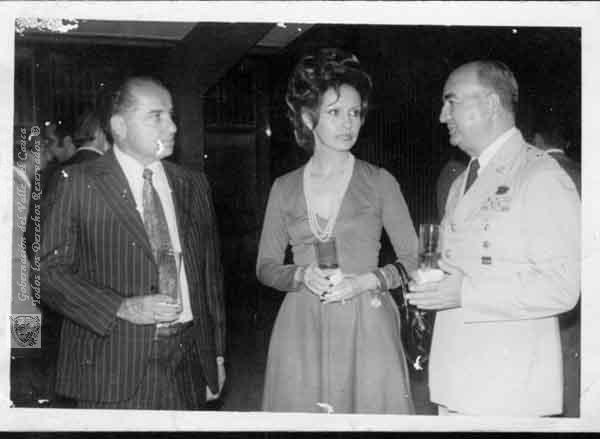 Humberto Vélez, Amparo Velásquez y el general por identificar. Celebración en la defensa civil con las personalidades del municipio de Santiago de Cali, 1968.