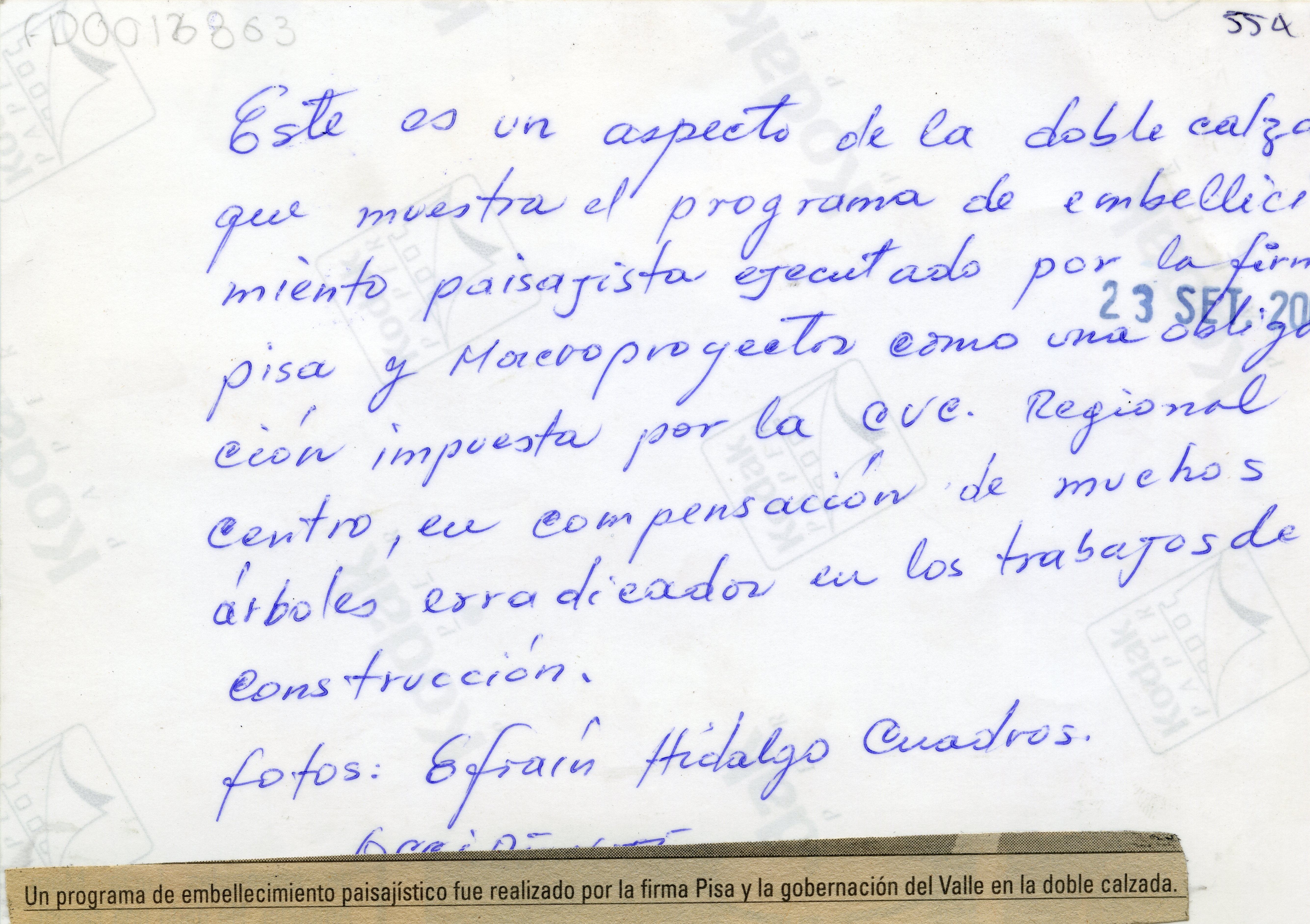 Al Reverso de la fotografía dice: "Este es un aspecto de la doble calzada que muestra el programa de embellecimiento paisajista ejecutado por la firma Pisa y Macroproyectos como una obligación impuesta por la C.V.C. Regional Centro, en compensación de muchos árboles erradicados en los trabajos de construcción." Se anexa recorte: "Un programa de embellecimiento paisajista fue realizado por la firma Pisa y la gobernación del Valle en la doble calzada."