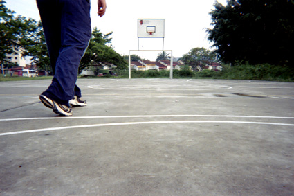 Toma a ras de piso, donde se puede apreciar al extremo izquierdo las piernas de una persona caminando por una cancha de baloncesto. Al fondo el tablero de una de las canchas y algunas viviendas.