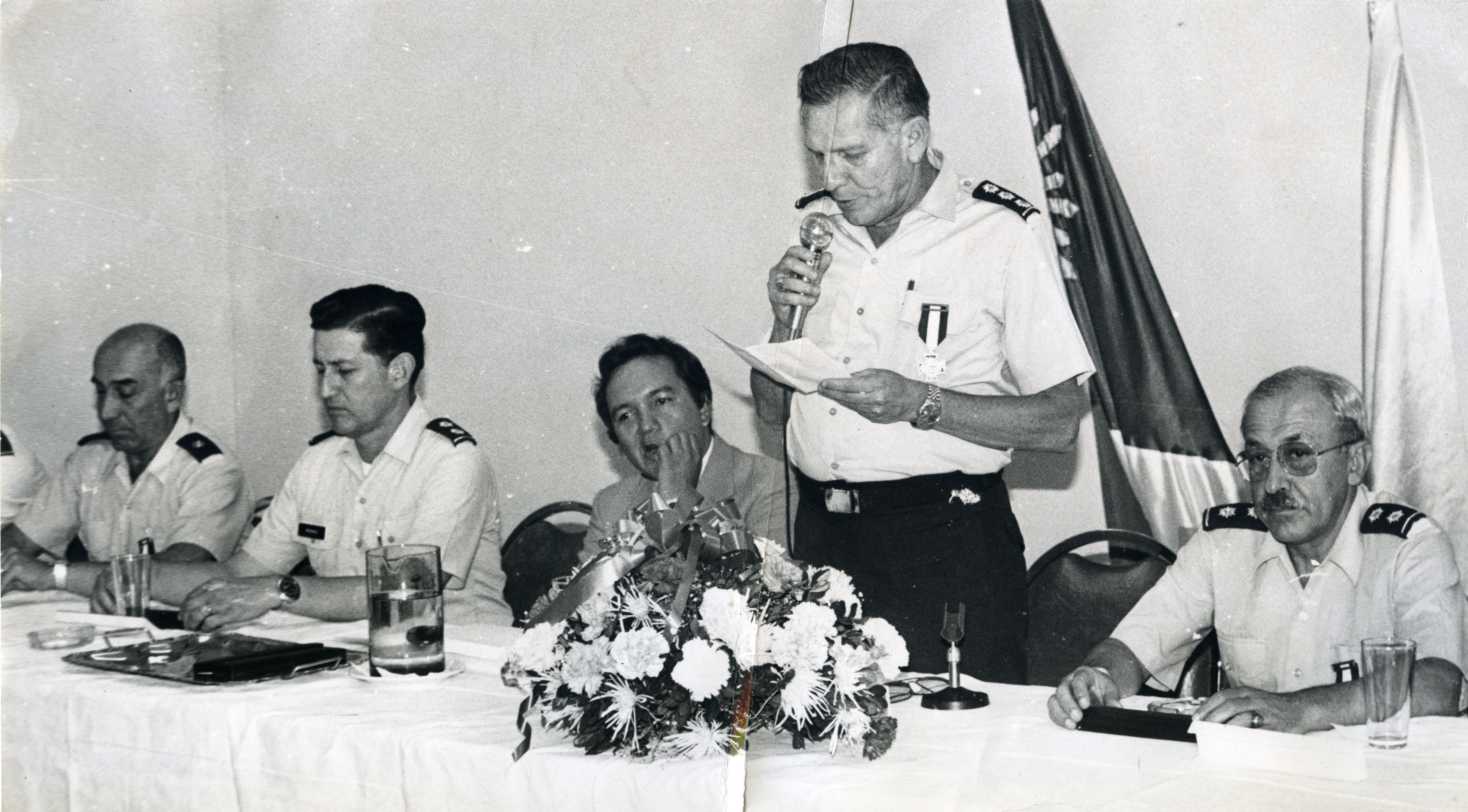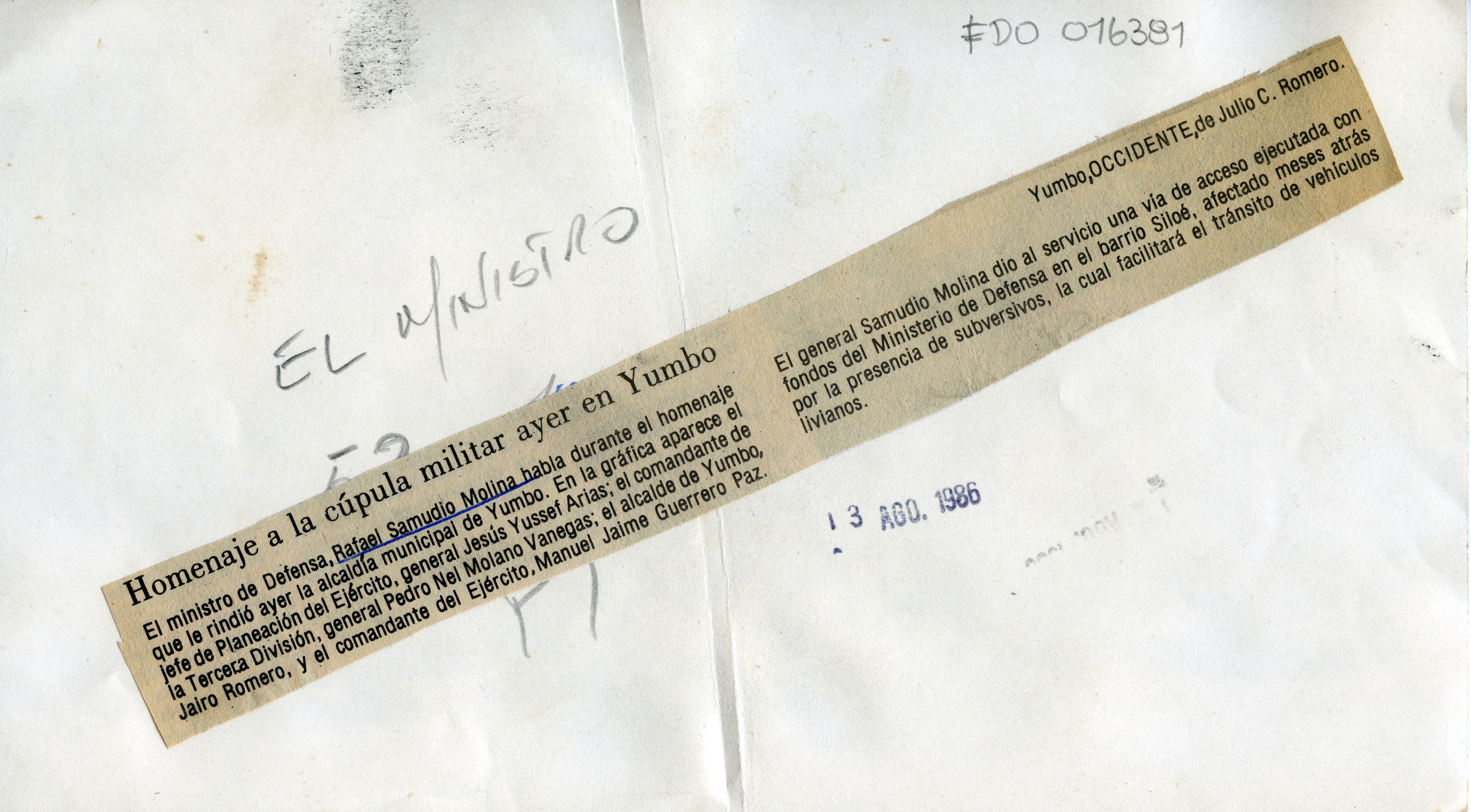 Al reverso de la fotografía se anexa recorte:"Homenaje a la cúpula militar ayer en Yumbo. El ministro de Defensa, Rafael Samudio Molina habla durante el homenaje que le rindió ayer la alcaldía municipal de Yumbo. En la gráfica aparece el jefe de Planeación del Ejército, general Jesús Yussef Arias; el comandante de la Tercera División, general Pedro Nel Molano Vanegas; el alcalde de Yumbo, Jairo Romero, y el comandante del Ejército, Manuel Jaime Guerrero Paz. El general Samudio Molina dio al servicio una vía de acceso ejecutada con fondos del Ministerio de Defensa en el Barrio Siloé, afectado meses atrás por la presencia de subversivos, la cual facilitará el transito de vehículos livianos"