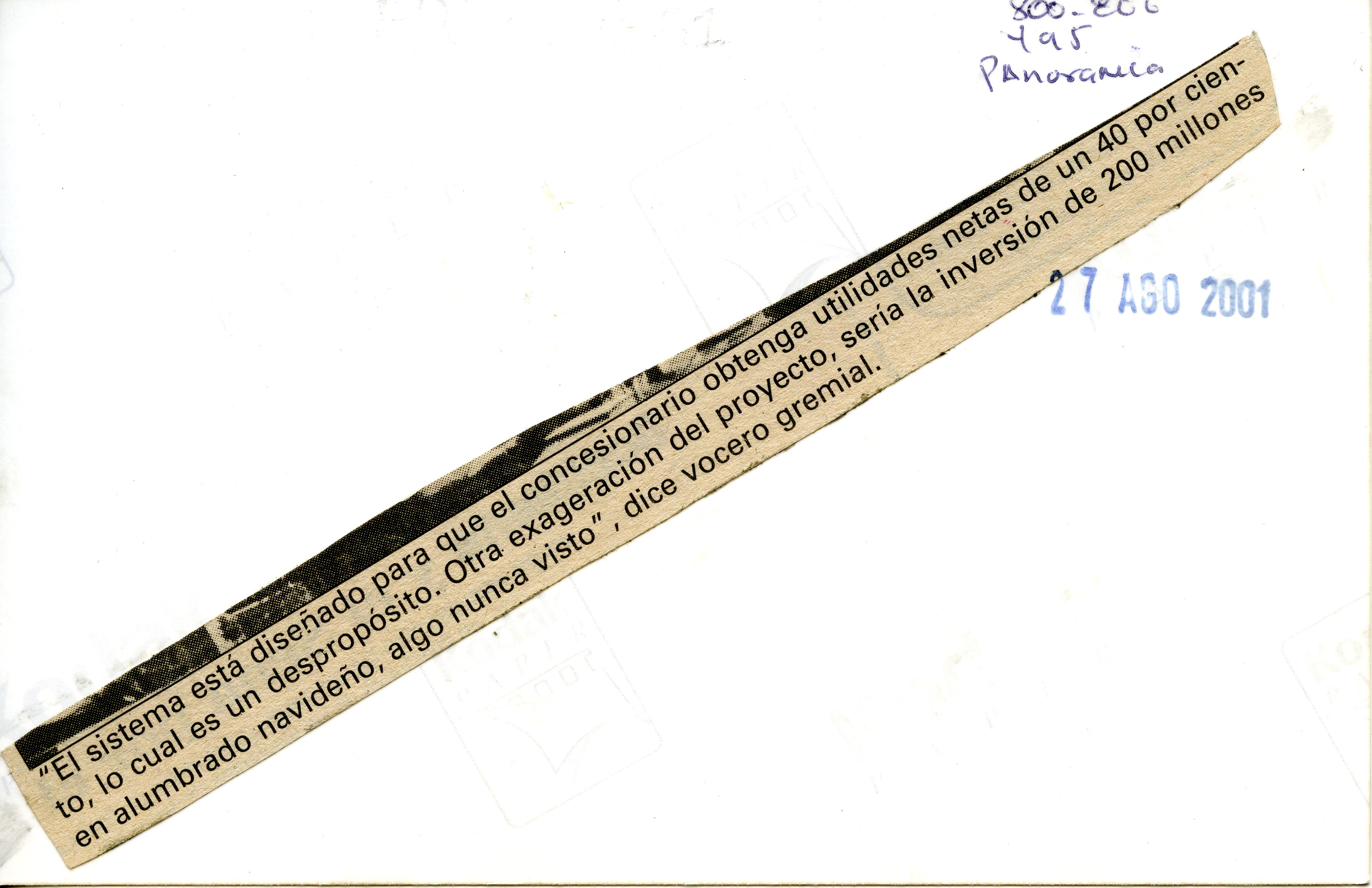 Reverso:""El sistema está diseñado para que el concesionario obtenga utilidades netas de un 40 por ciento, lo cual es un despropósito. Otra exageración del proyecto, sería la inversión de 200 millones en alumbrado navideño, algo nunca visto", dice vocero gremial."