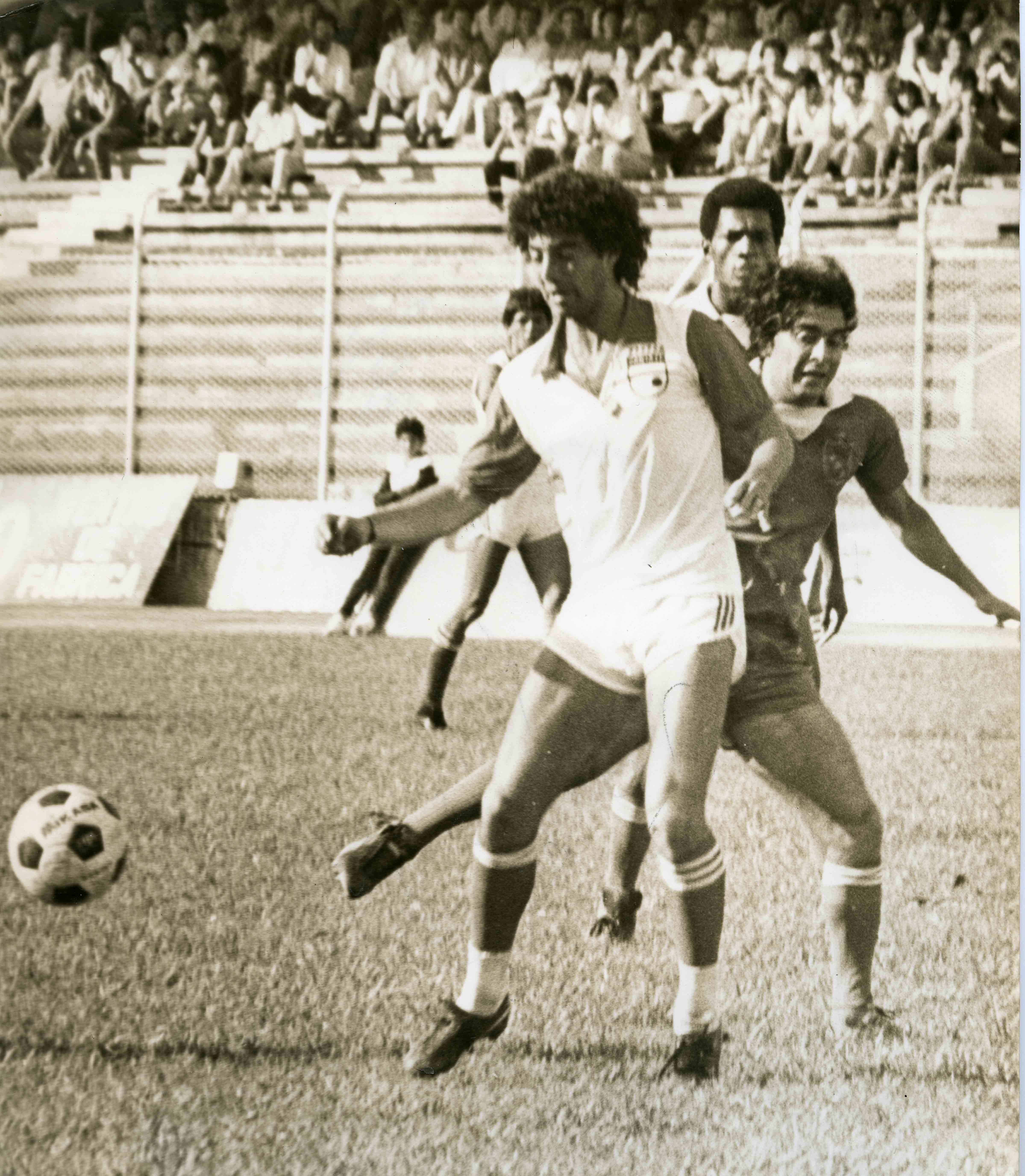 Battaglia, Jugador del América de Cali disputando el balón en el Estadio Pascual Guerrero en Santiago de Cali >El Archivo del Patrimonio Fotográfico y Fílmico del Valle del Cauca es responsabilidad de la Biblioteca Departamental del Valle Jorge Garcés Borrero, por convenio de cooperación suscrito con la Secretaria del Cultura Departamental, con el fin de aunar esfuerzos para su conservación, preservación y divulgación del Archivo entre la comunidad Vallecaucana, especialmente entre los estudiantes e investigadores que visitan la Biblioteca, propiciando el su uso y consulta permanente. La universidad Icesi es un colaborador en el proceso de difusión, facilitando la tecnología que permite la consulta de las imágenes.