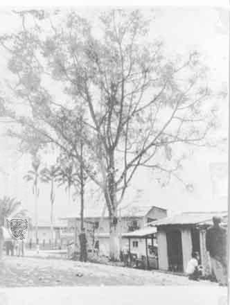 Centro y plaza principal de La Cumbre. A mano derecha se ubicaba el granero La Espiga de propiedad del señor Azael Sánchez. C. 1940.