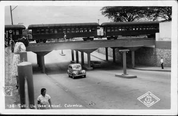 Paso del ferrocarril, carrera 1ª entre calle 25 y 26. La dinámica económica que envolvió a Cali desde el amanecer del Siglo XX, hizo necesario la construcción de una infraestructura adecuada para los retos que semejante actividad planteaba. Santiago de Cali, fecha aproximada, 1946.