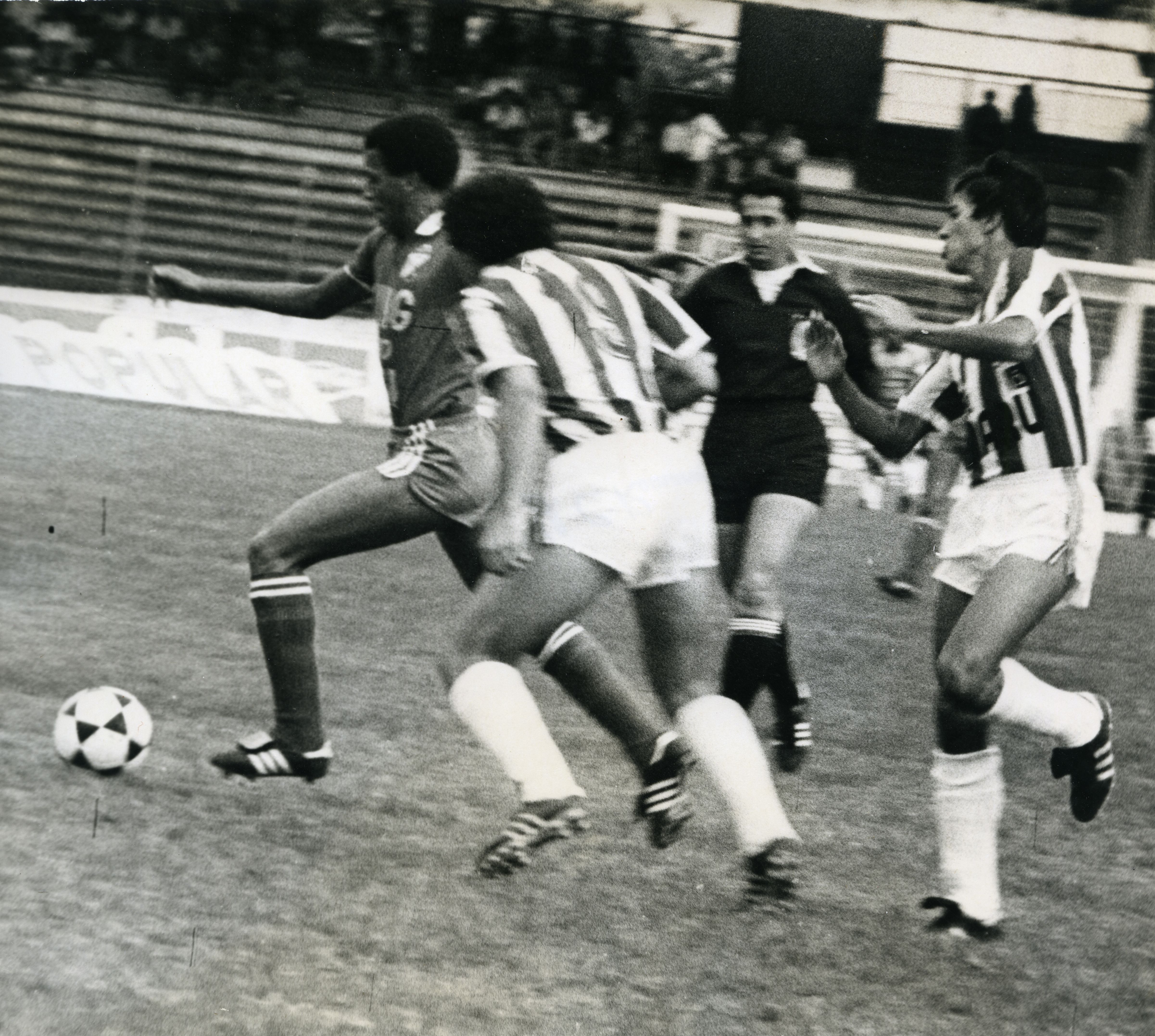 Escena del partido realizado entre el Deportivo Cali 1 Nacional 0, en el estadio Olímpico Pascual Guerrero. Jugador del Cali domina el esférico. Se aprecia público en la tribuna. Observamos en la camiseta jugador del Cali que dice: King Casino Aruba