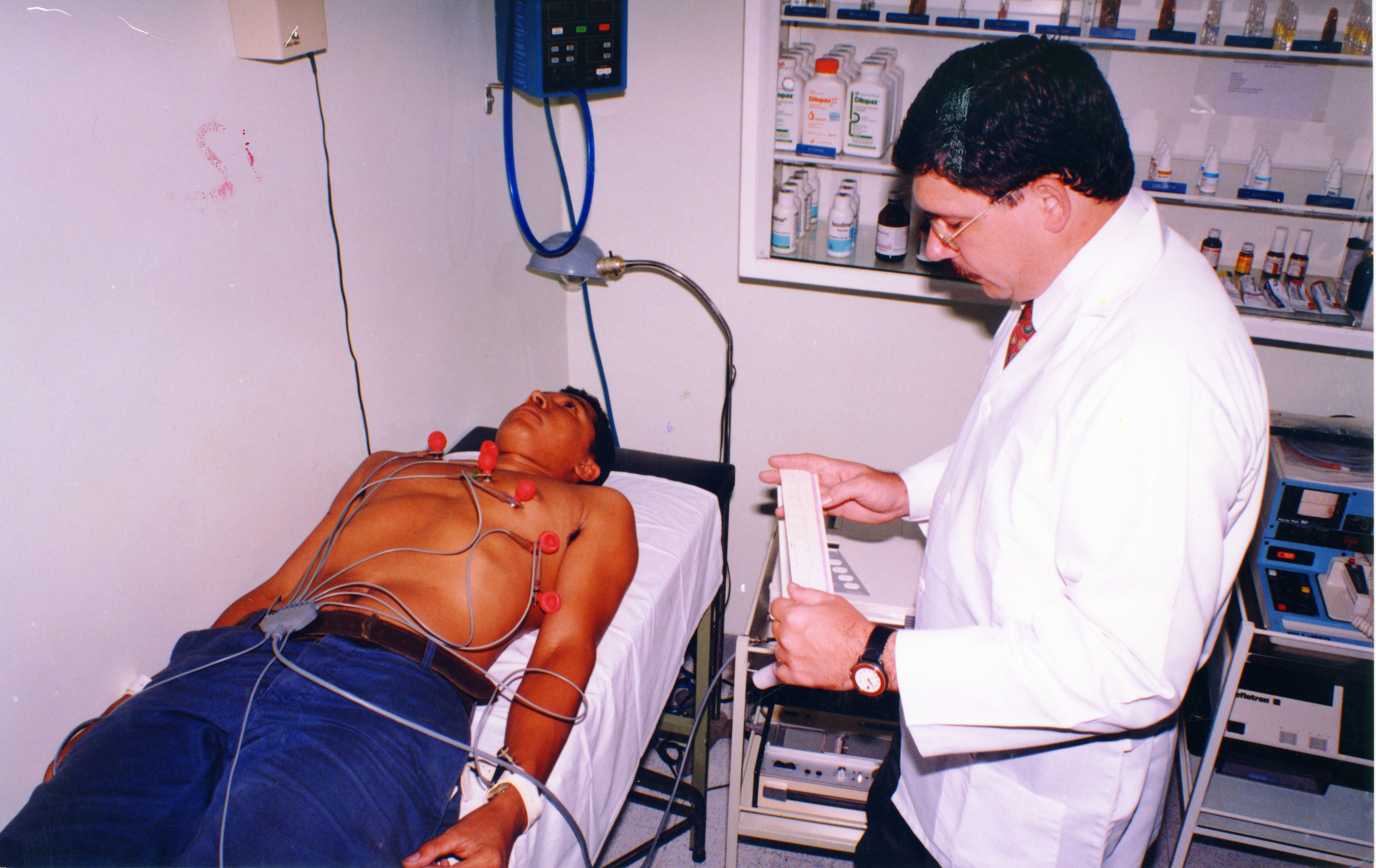 Salud ocupacional de Colgate Palmolive en laboratorio toma examen de electrocardiograma a empledado.