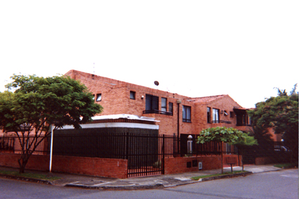 Plano general.  Imagen tomada en exterior, donde se puede apreciar la fachada de una vivienda ubicada en una esquina, con muros de ladrillo a la vista y rejas de color negro.
