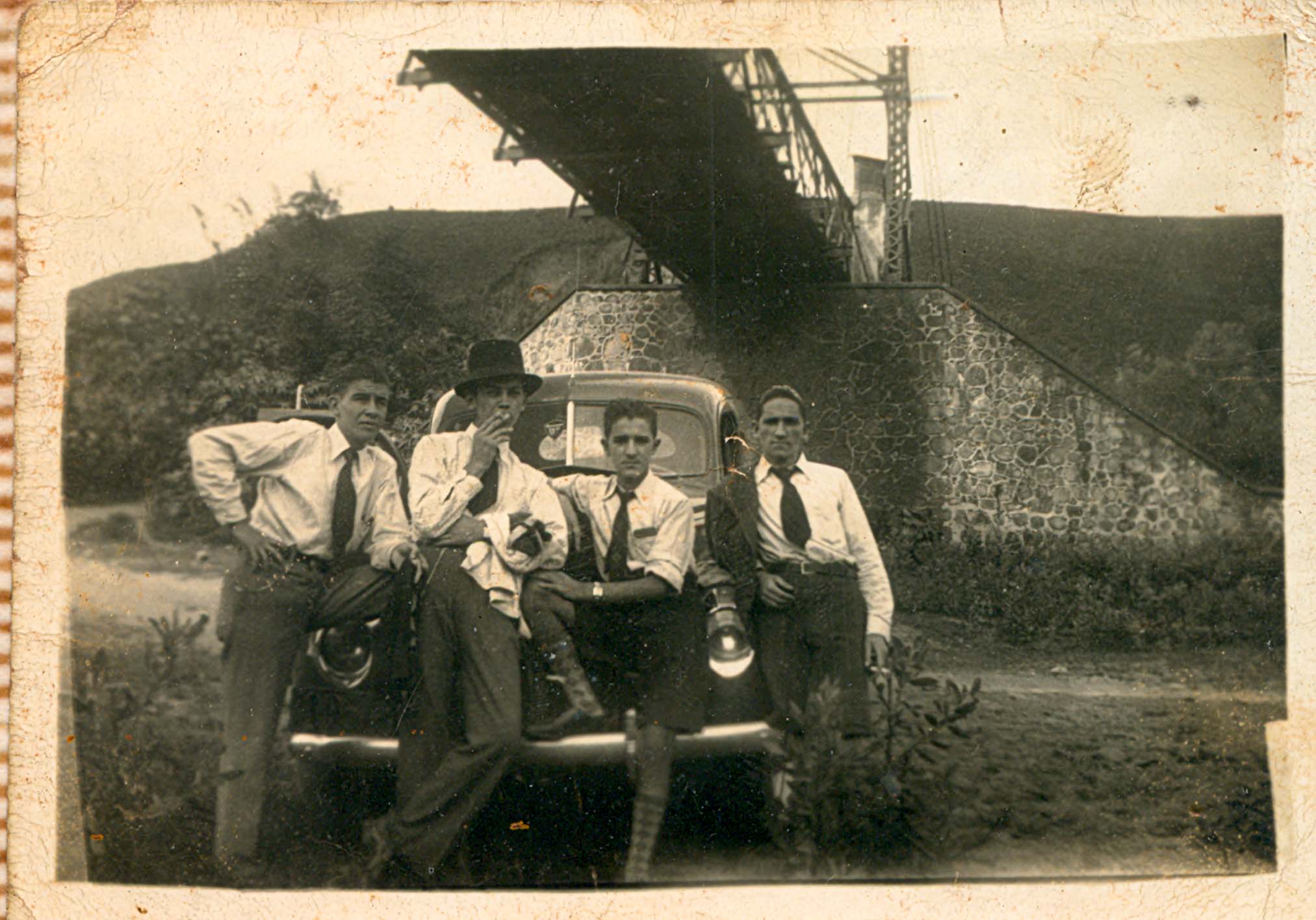 Caicedonia, Valle del Cauca. Fundado en 1905, por Daniel Gutiérrez, Jorge Moreno, Zenón Baena. Municipio desde 1923. Economía importante en agricultura, caficultura, ganadería, comercio, entre otros. Atractivo turístico: cerro de cubides, club de tiro, caza y pesca, río barragán, paraje natural, lagos. Observamos en la imagen, paseo de amigos al río barragán. aparecen en la foto Marino Atehortua, José Jesús Duque, Marcos Grajales y otros. Se aprecia vestuario, carro, casa y puente de la época