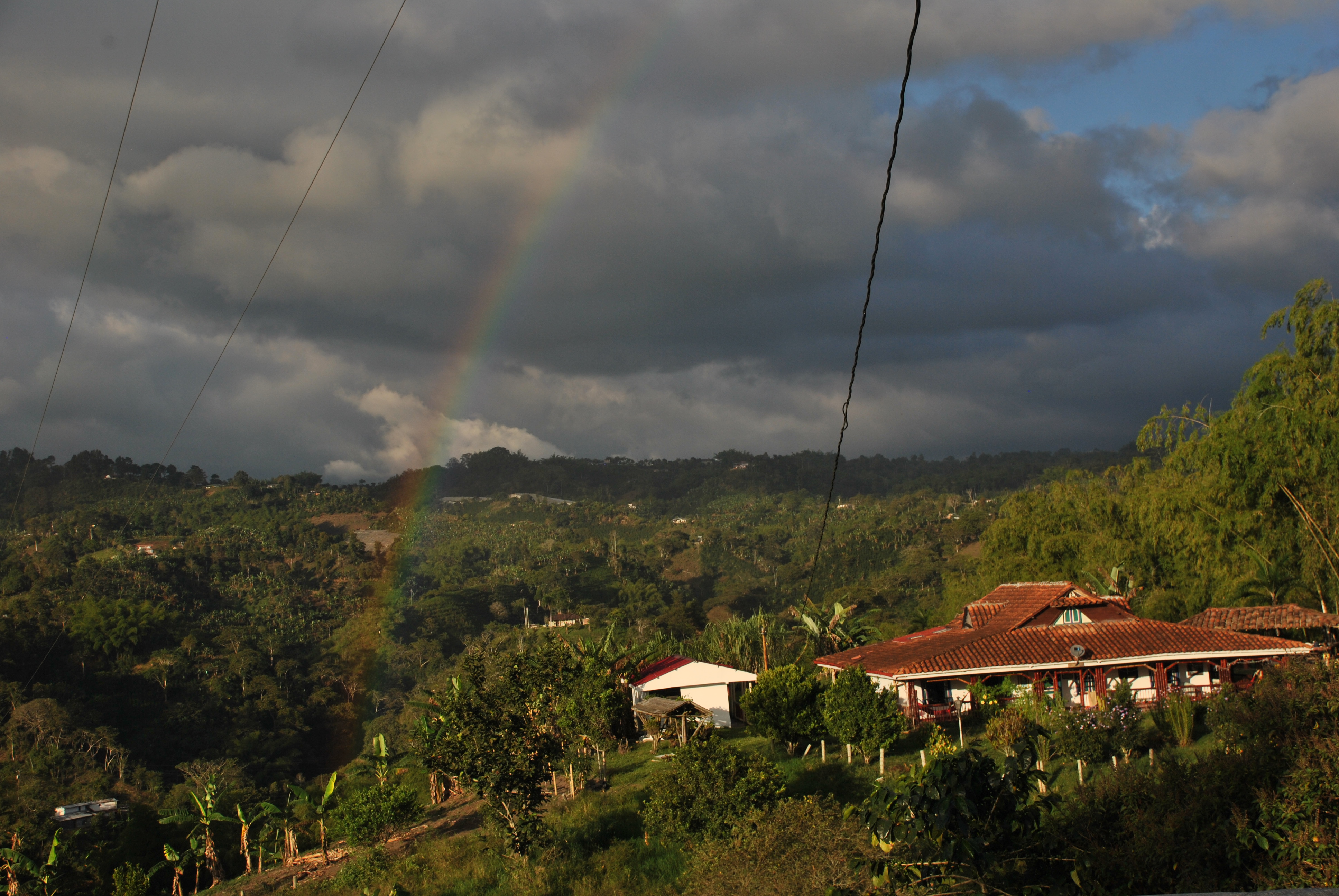 Ulloa, Valle del Cauca. Fundado en 1922, por Leocadio Salazar. Nombres: Villa Sucre. Municipio desde 1928. Economía importante en Agricultura, Ganadería, Trapiches Paneleros, Trilladoras de Café y Riqueza Natural. Observamos en la imagen, panorámica de finca y sus cultivos de plátano. Se aprecia hermosa vista del arco iris