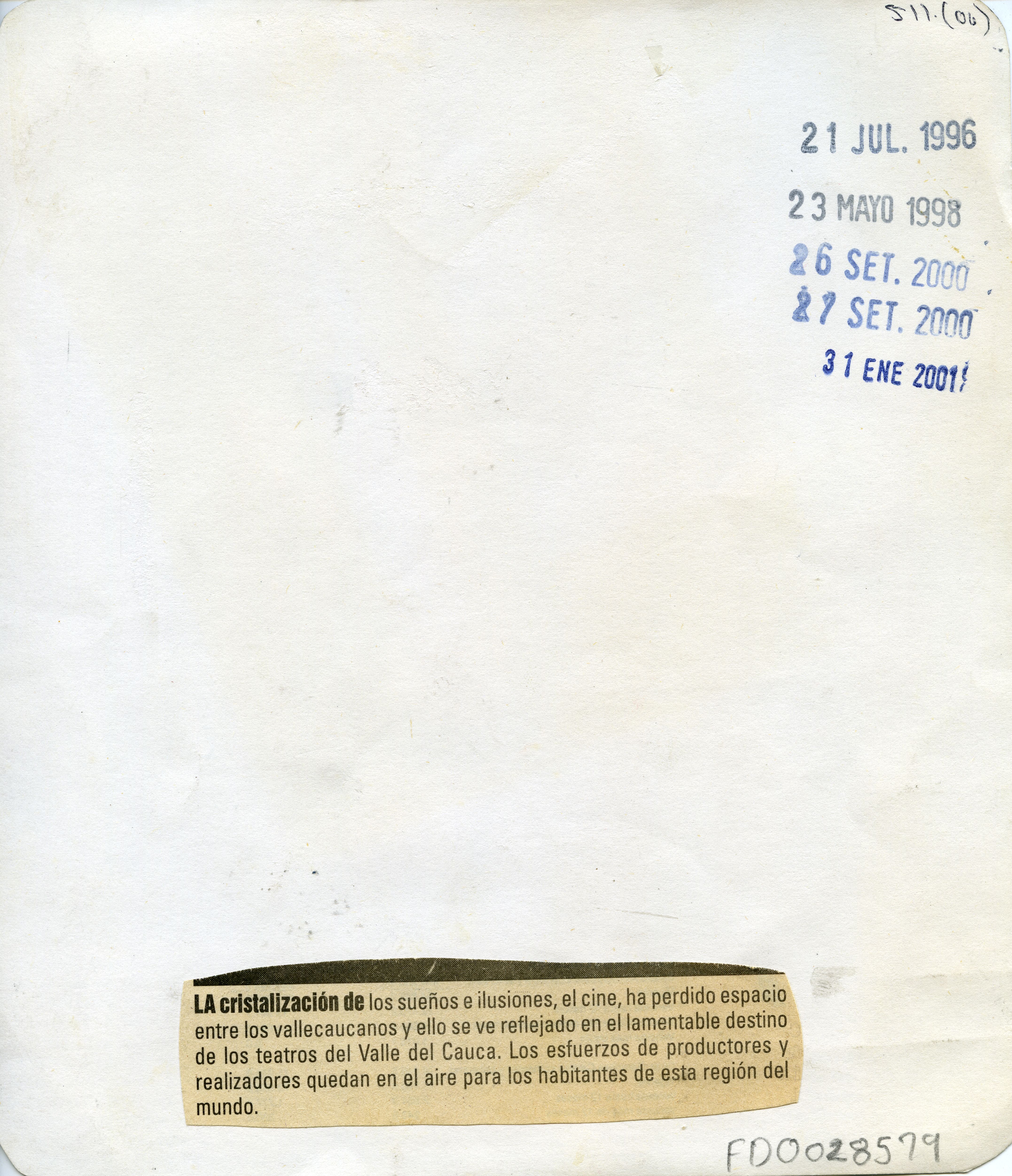 Reverso: " La cristalización de los sueños e ilusiones,el cine, ha perdido espacio entre los Vallecaucanos y ello se ve reflejado en el lamentable destino de los teatros del valle del cauca. Los esfuerzos de productores y realizadores queda en el aire para los habitantes de esta región del mundo."