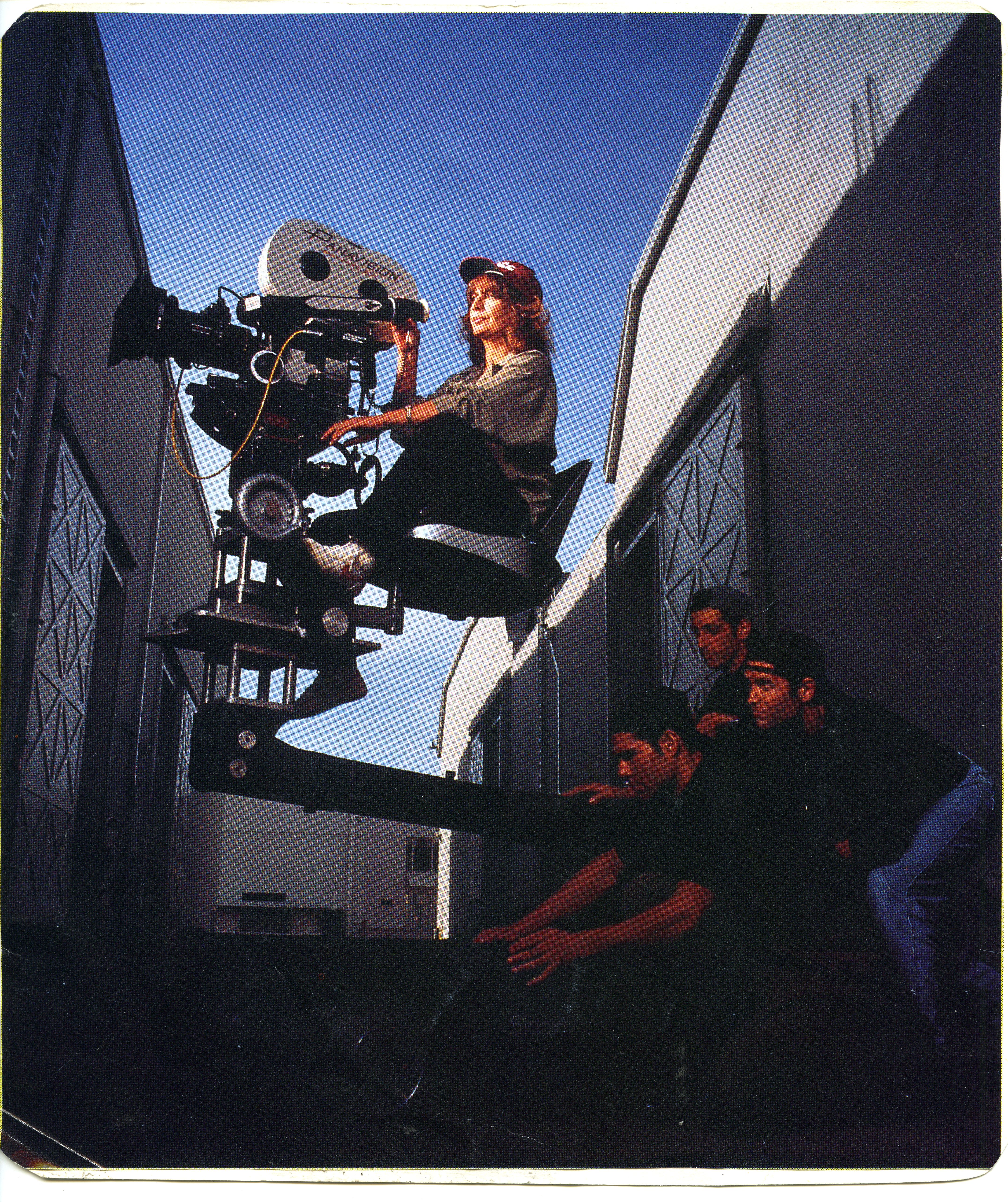 Equipo de grabación operando una cámara soportada sobre un mecanismo movible elevado. El artilugios operado directamente por mujer .