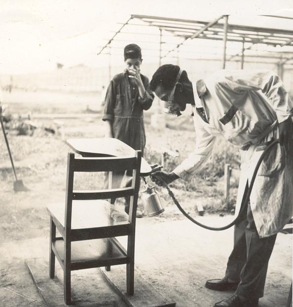 Profesor de la Escuela de Artes y Oficios, en práctica de pintura con uno de sus estudiantes. Esta institución se creo por Acuerdo Municipal No 25 de 1933, que ordeno construir una escuela de formación técnico-práctica, para dar respuesta a la necesidad de mano de obra capacitada, requerida por el crecimiento industrial y urbano de la ciudad. A partir de 1945 se le empezo a llamar Instituto Antonio José Camacho. Actualmente se conoce como Instituto Educativo Técnico Industrial Antonio José Camacho. Santiago de Cali, fecha aproximada, 1940.