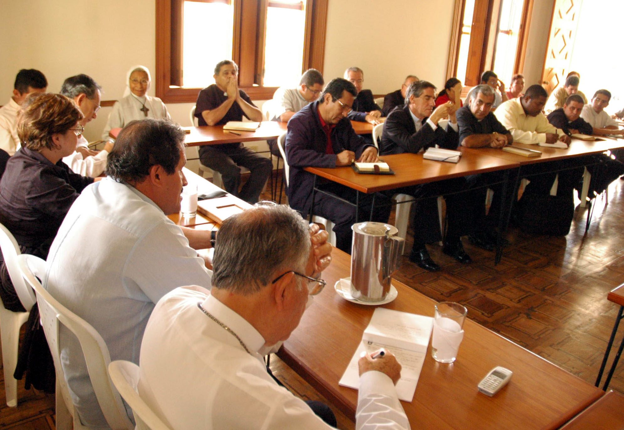 Se aprecia al gobernador del Valle del Cauca Angelino Garzón en reunión en la gobernación con arzobispo de Cali y demás miembros del episcopado