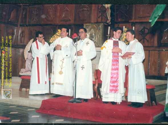 Jaime Eusse, Gildardo Vélez, Alfonso Vivas, Gustavo Aristizábal e Ignacio Reyes, sacerdotes de la parroquía de Versalles, en la celebración Eucarística de la novena navideña. Versalles, 1991.