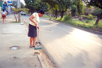 Plano general. Mujer barriendo en la calle. Al lado derecho vegetación y canal de aguas residuales. En el plano medio calle. Exterior día.