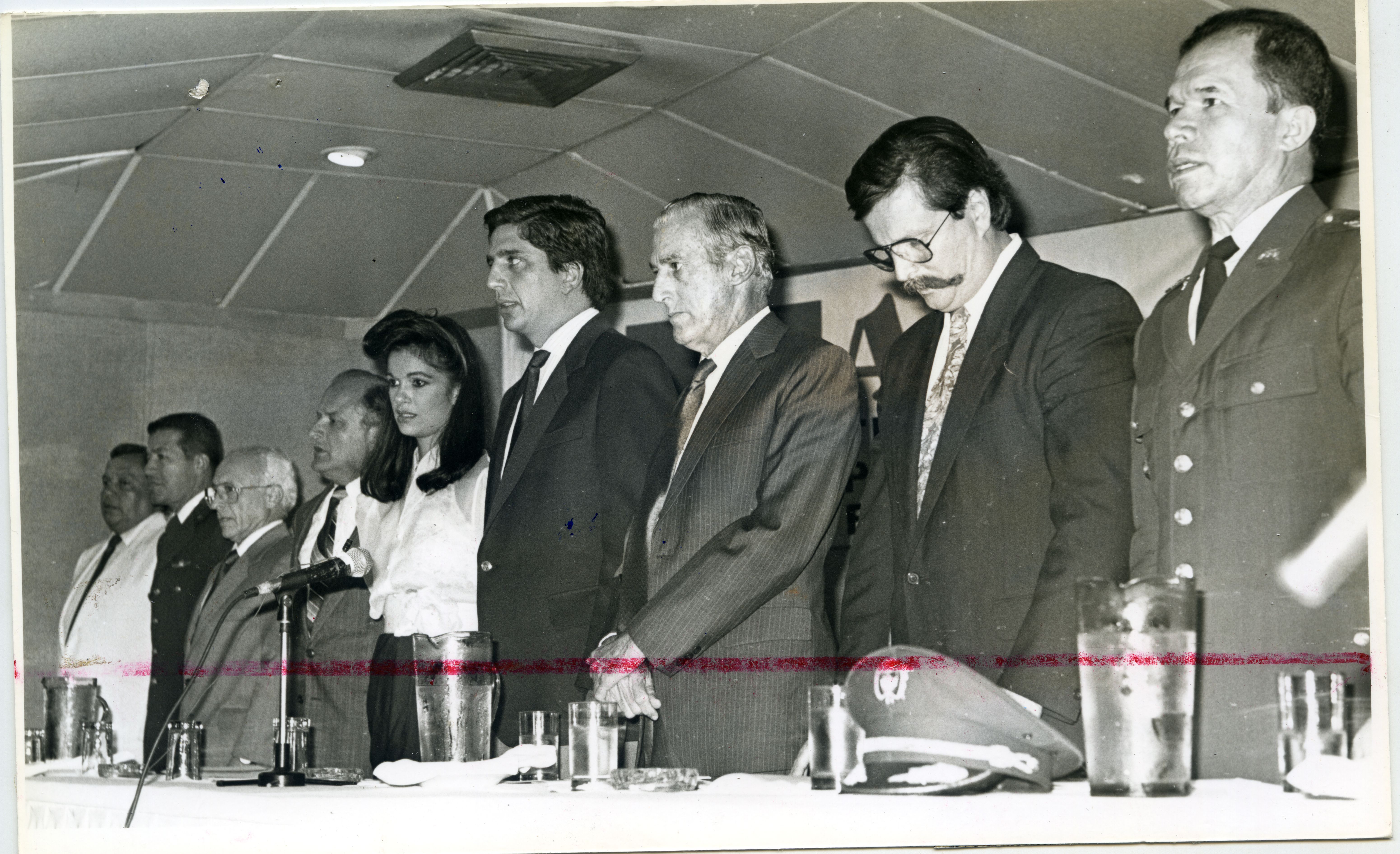 Reverso: El gobernador Mauricio Guzmán Cuevas rindió balance de actividades ante los dirigentes gremiales de la comarca. El sector privado le ofreció respaldo al mandatario seccional. En la gráfica, Germán Villegas, alcalde de Cali; Luz Elena Azcárate de Guzmán, primera dama del departamento; Ernesto Delima, presidente del comité Empresarial permanente; Fabio Rodríguez, director de la cámara de comercio, y autorizades militares
