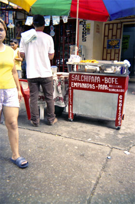 Plano medio. Exterior día. Comercio ambulante. Sujeto en contraplano. Mujer entrando en escena desde costado izquierdo.