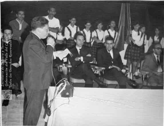 Inauguración del colegio Julián Trujillo. Sentado, Rodrigo Lloreda Caicedo. Trujillo, instalciones del Colegio, 07-02-70.