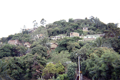 Imagen tomada en exterior, donde se puede apreciar la vista panorámica de algunas viviendas en una loma en medio de abundante vegetación