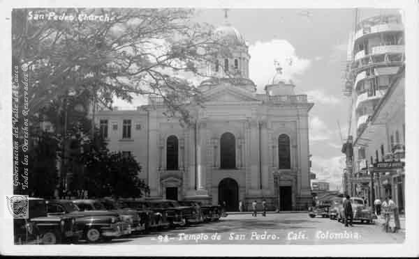 s. n., s. n. & s. n. (1942). Panorámica de la Plaza de Cayzedo, al fondo la Catedral de San Pedro y las berlinas de la Época & 201146. OTRO: Biblioteca Departamental Jorge Garces Borrero.