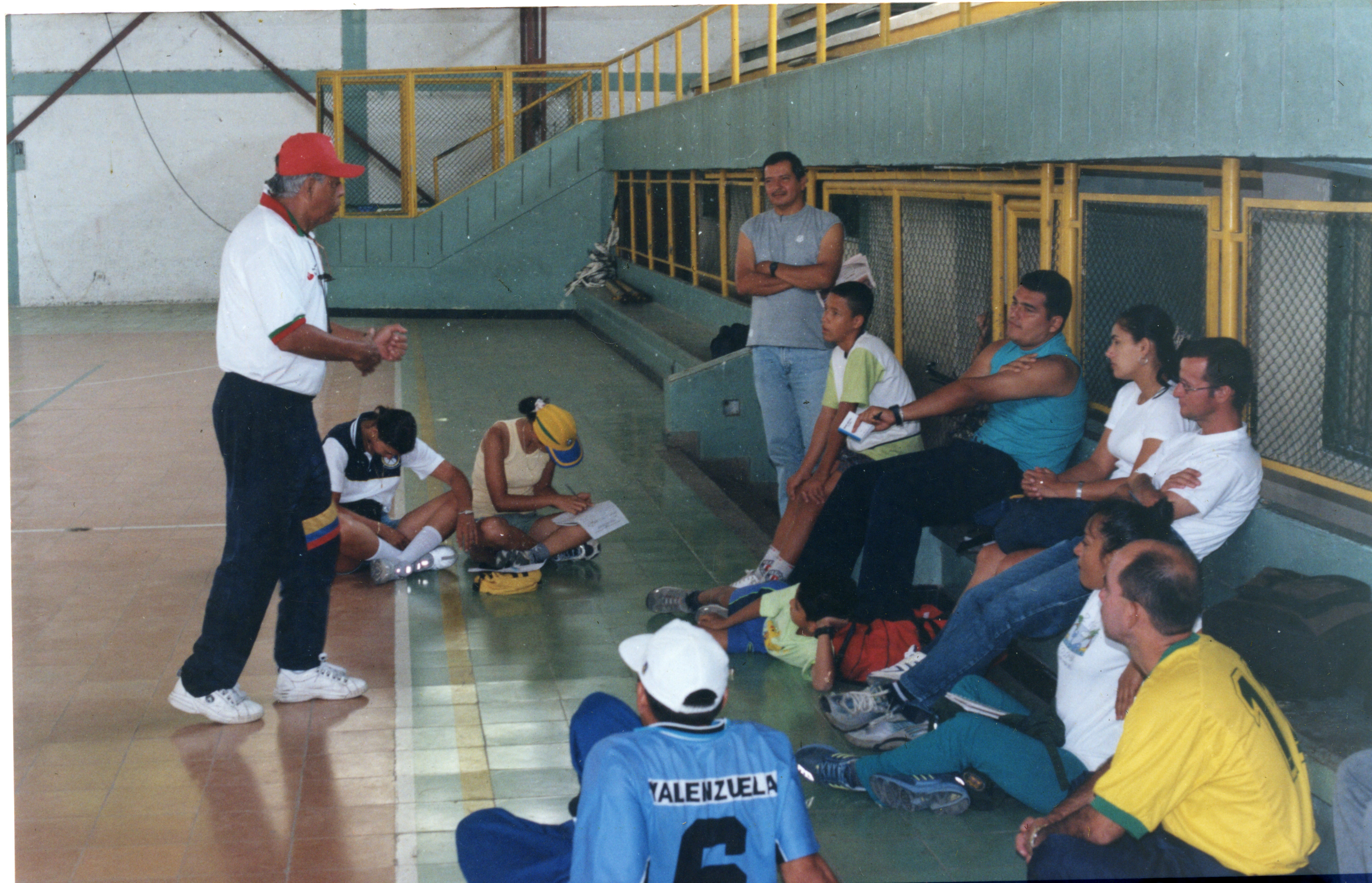 Al reverso de la fotografía dice: La Gerencia de Indervalle, a cargo de Carlos Alberto Lenis, desplazó hasta Roldanillo al instructor de atletismo, Pedro Grajales, para capacitar a docentes en Educación Física, de los municipios de Bolívar, La Unión, El Dovio y Roldanillo.
