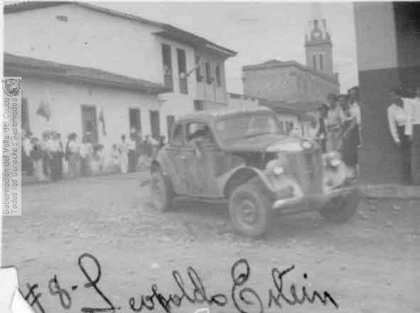 Carrera internacional de autos Buenos Aires-Caracas a su paso por el municipio de Caicedonia. Automóvil # 8 conducido por Leopoldo Estein. 1948