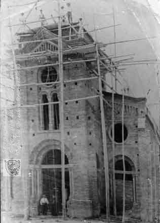 Construcción de la Iglesia de San Jorge, nótese a los obreros en andamios en guadua. 1930.